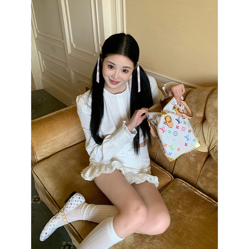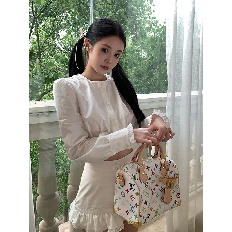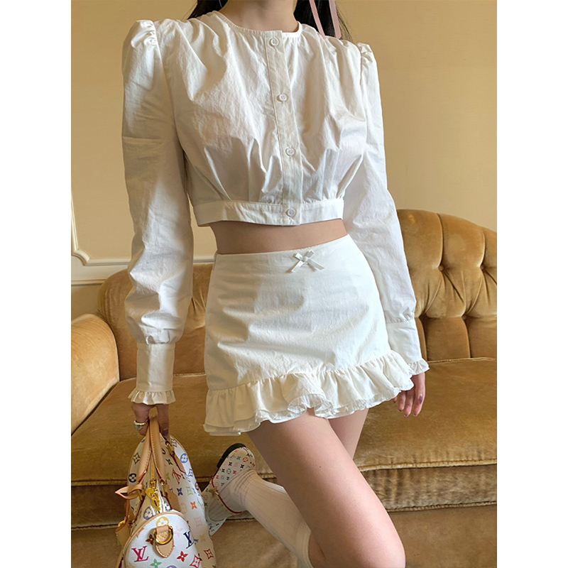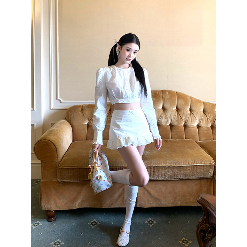 微胖韩系辣妹短款 高腰花边包臀裙套装 圆领长袖 女25年夏季 衬衫 XZY