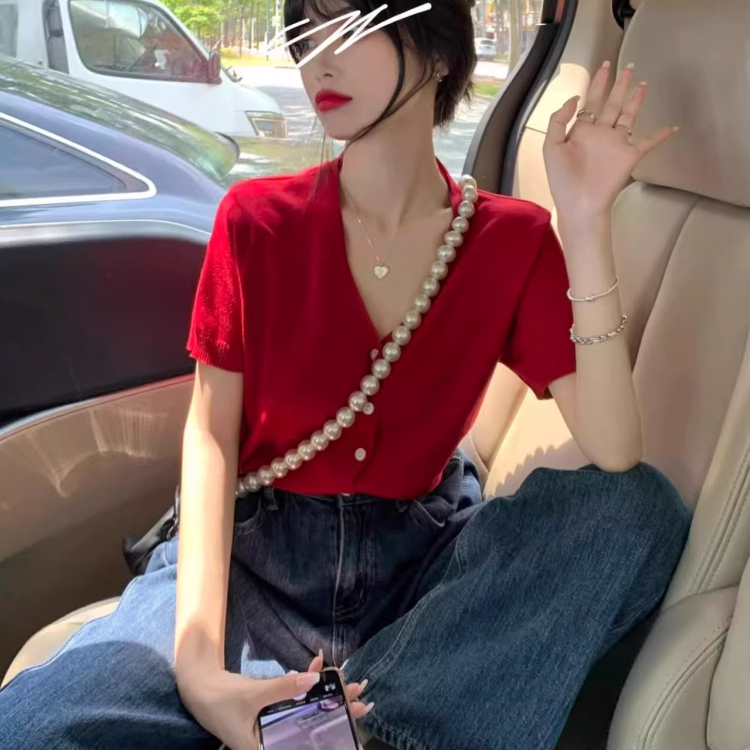 夏季 t恤女2025新款 设计感小众v领上衣 短袖 小香风红色冰丝针织开衫