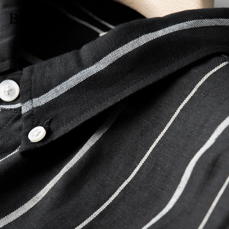 薄款 凉感夏季 中年商务休闲衬衣潮 男中袖 奢侈品黑色竖条纹棉麻衬衫