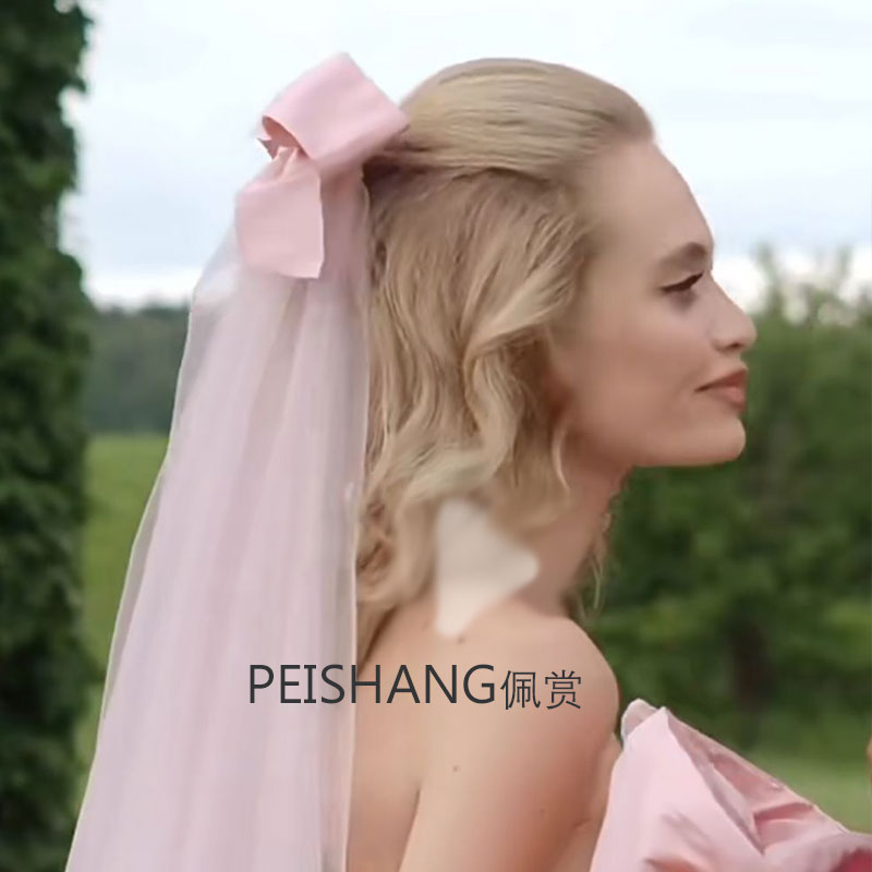 浅粉色丝带蝴蝶短款 双层婚纱礼服小头纱领证登记结婚新娘头纱头饰