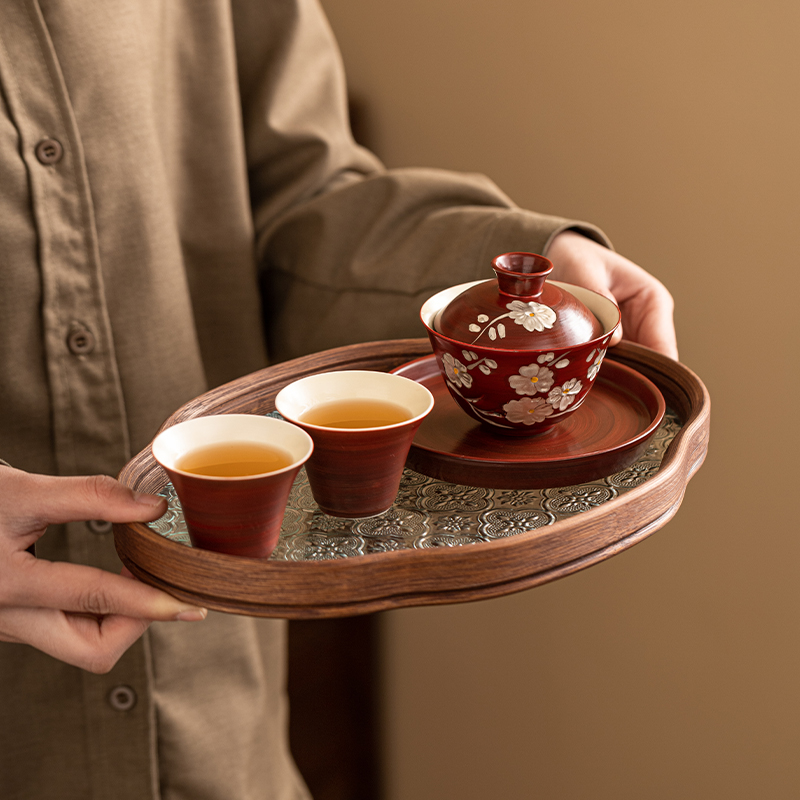 手绘山楂红陶瓷三才盖碗家用单个功夫茶具茶杯套装 描银泡茶敬茶碗
