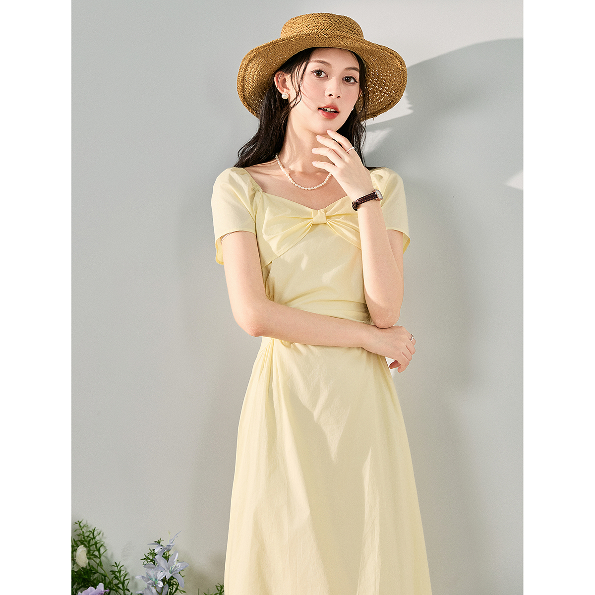 连衣裙多巴胺黄蝴蝶结可爱少女韩系l3 修身 唐狮25新款 女夏V领短袖
