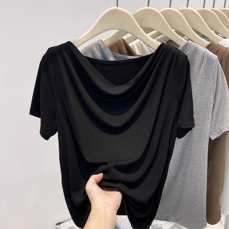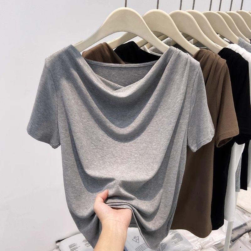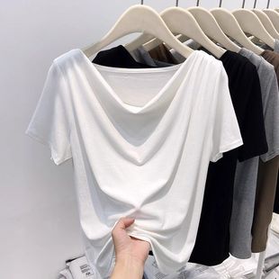 纯欲不规则荡领洋气内搭打底上衣 t恤女裝胖mm夏季 大码 莫代尔短袖