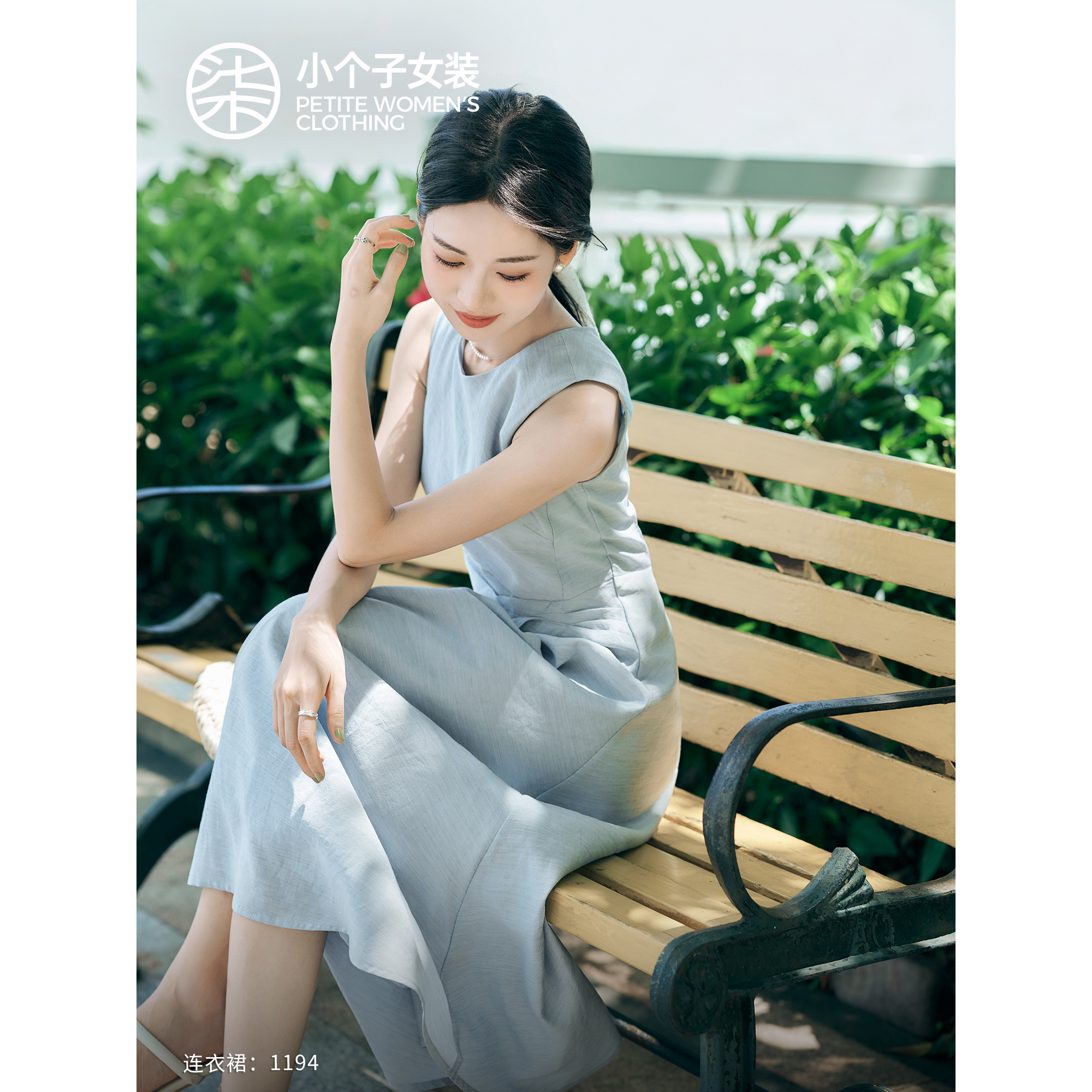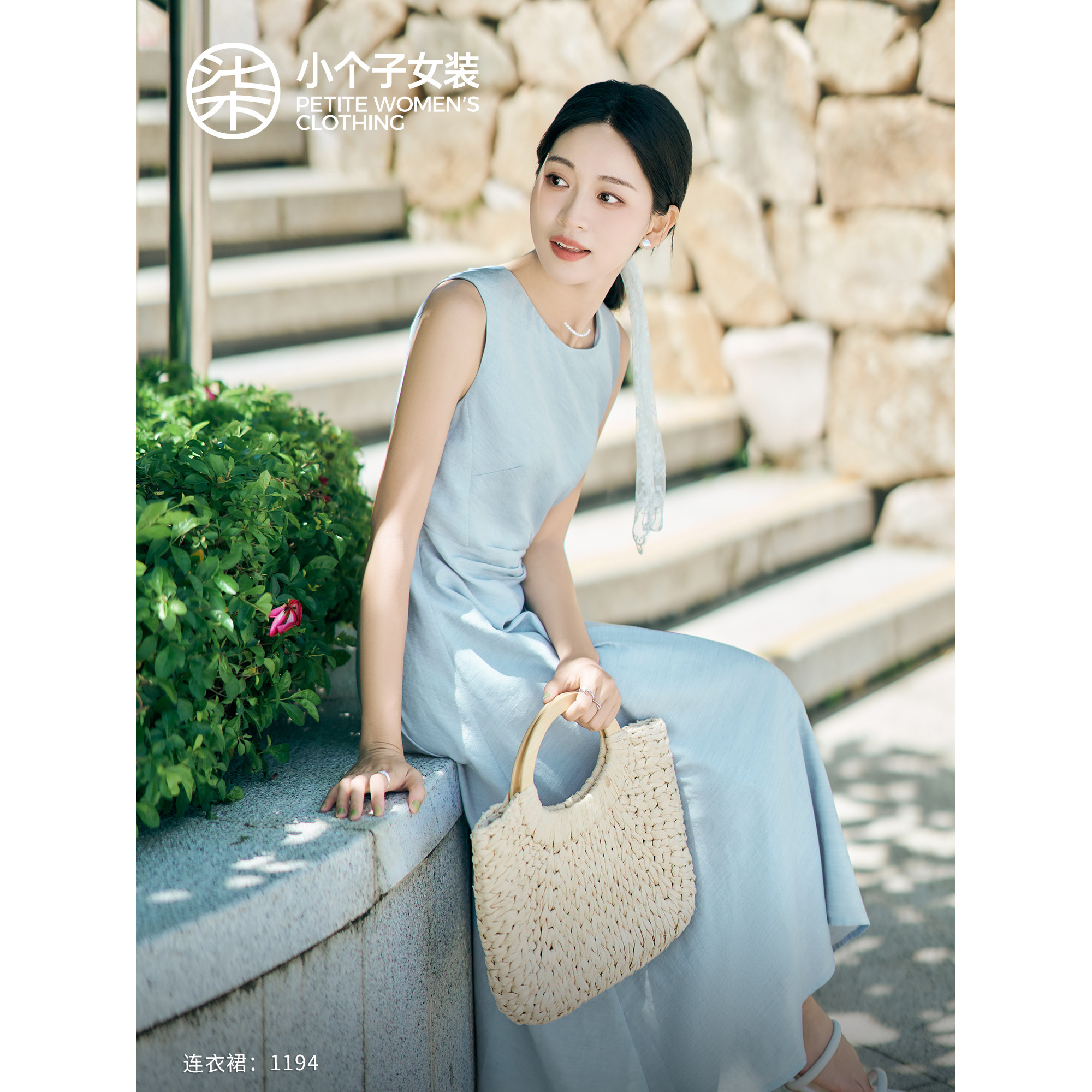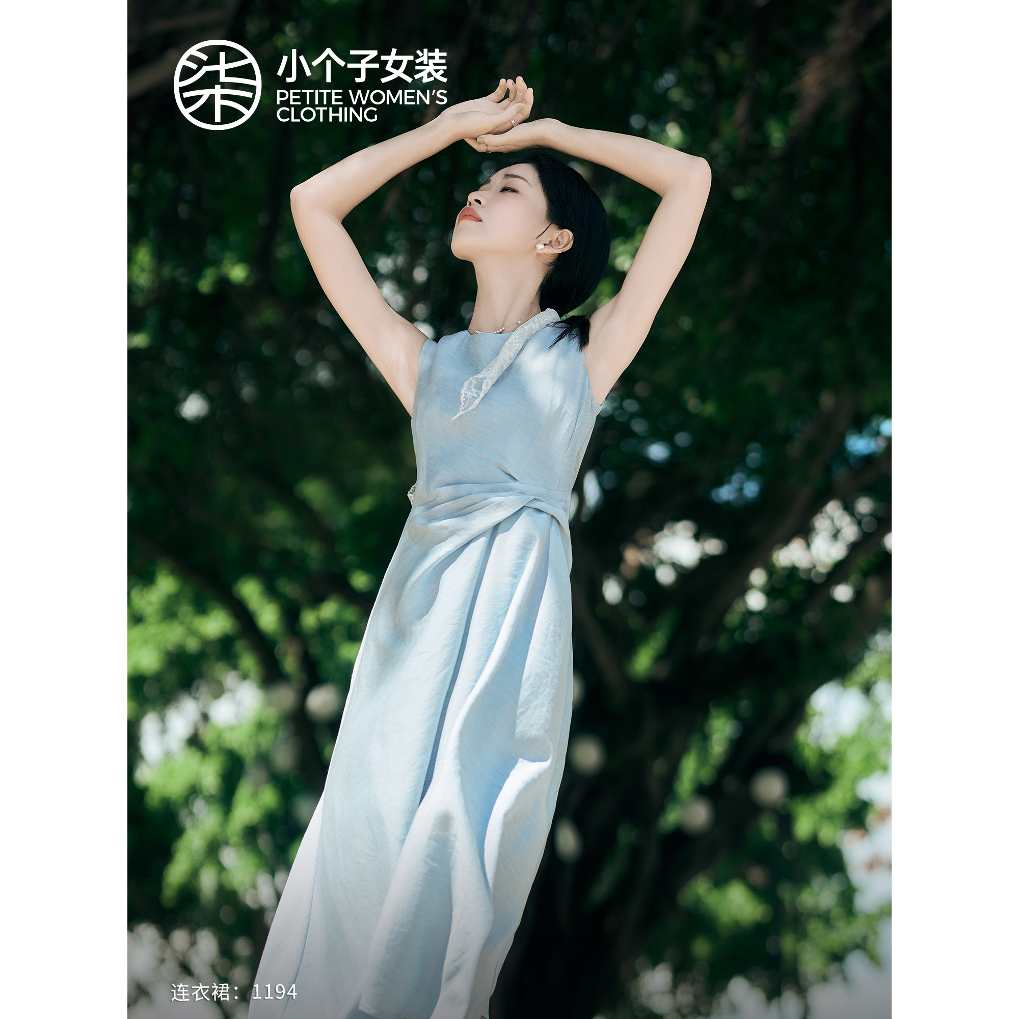 柒量一裁小个子夏日清新浅蓝无袖 连衣裙1194 扭结收腰长裙优雅时尚