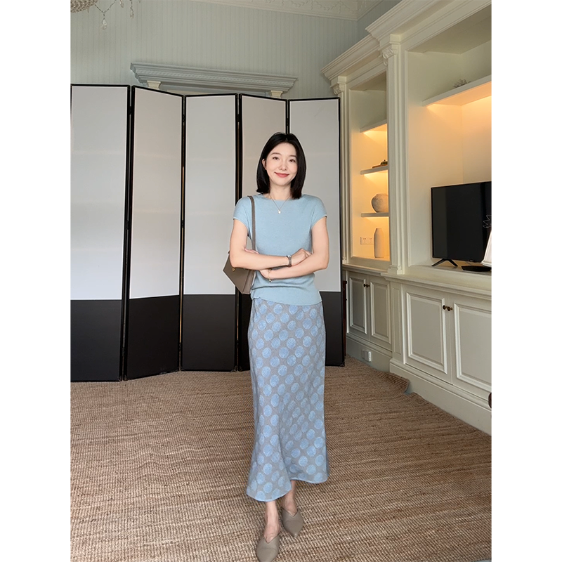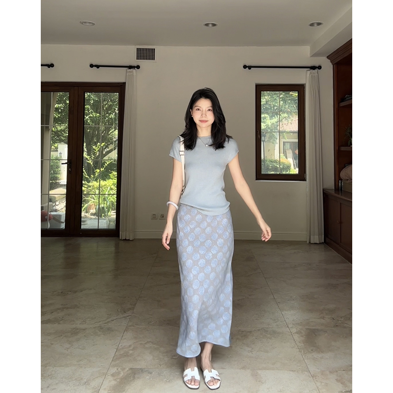 郭九九呢桑蚕丝天丝羊毛简约显瘦短袖 气质上衣开叉斜裁半身裙 夏季