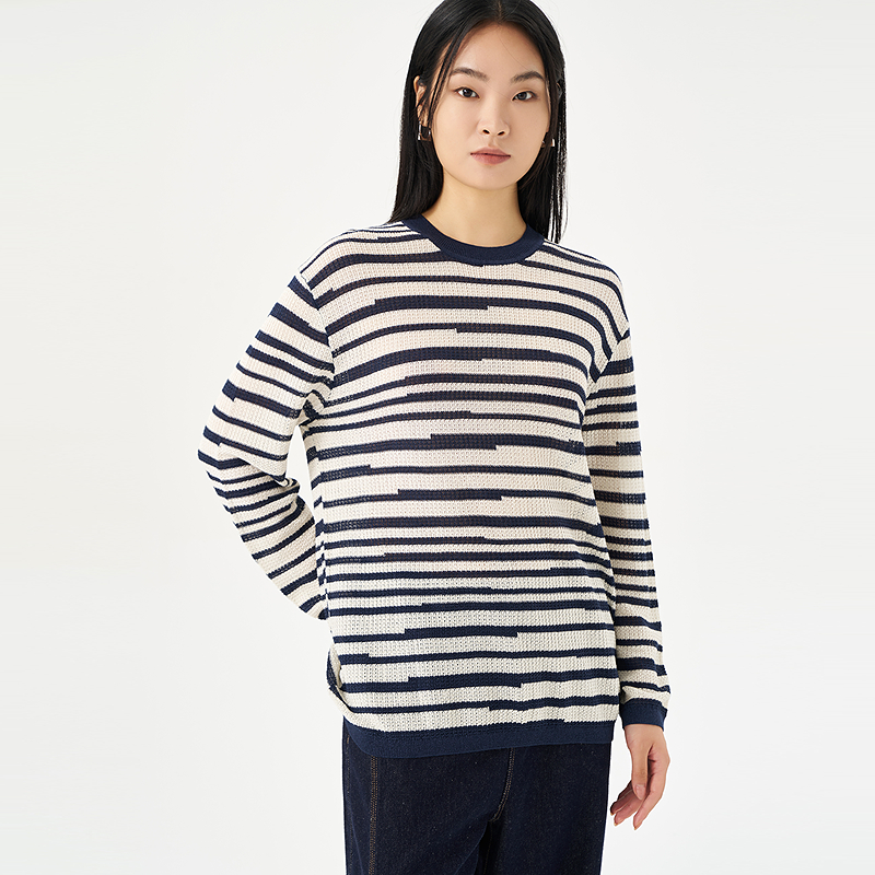 上衣女装 休闲百搭针织衫 不规则条纹圆领毛织套头衫 OTT2025秋新品
