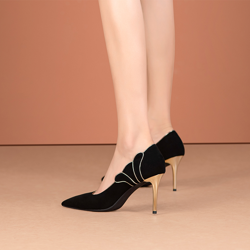 磨砂皮单鞋 女人百搭一脚蹬浅口高跟鞋 黑色尖头瓢鞋 新款 细跟春秋季