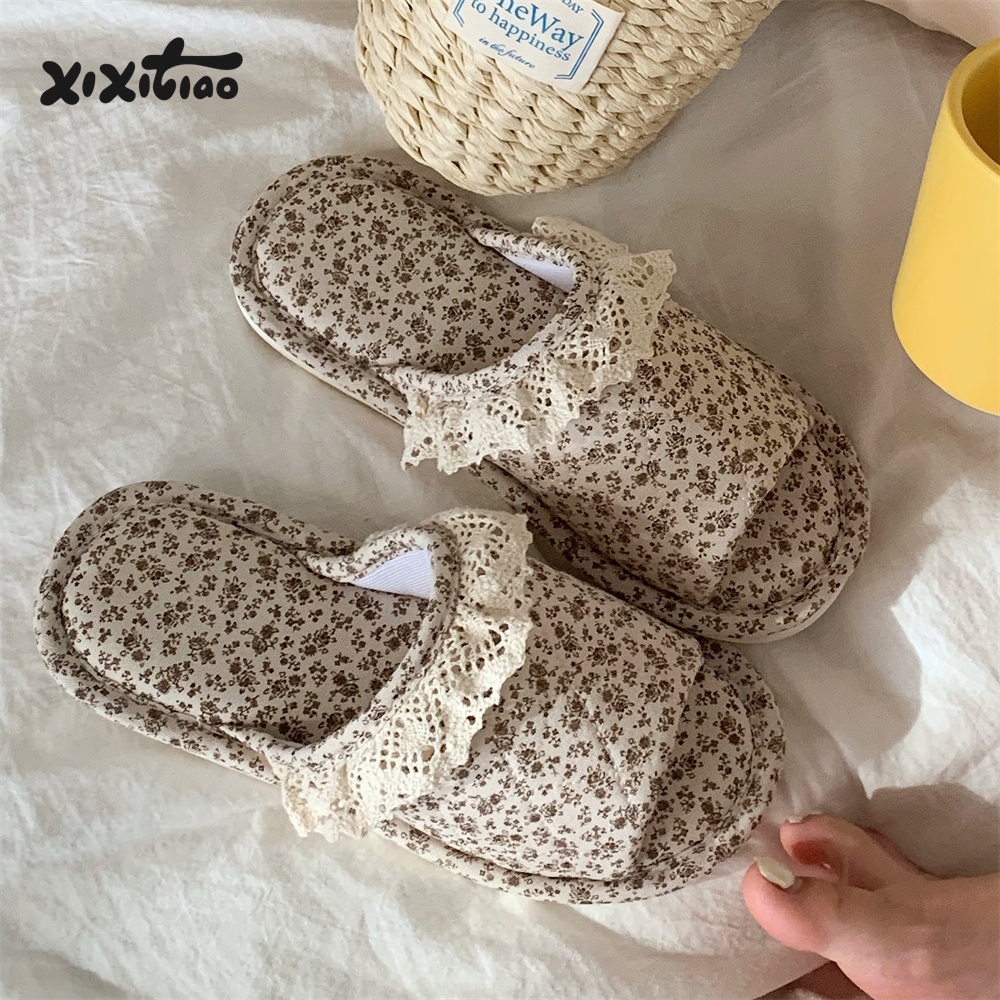 创意碎花蕾丝边一字棉拖室内防滑舒适软底吸汗四季 女 通用棉麻拖鞋