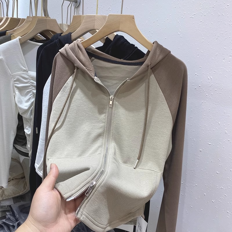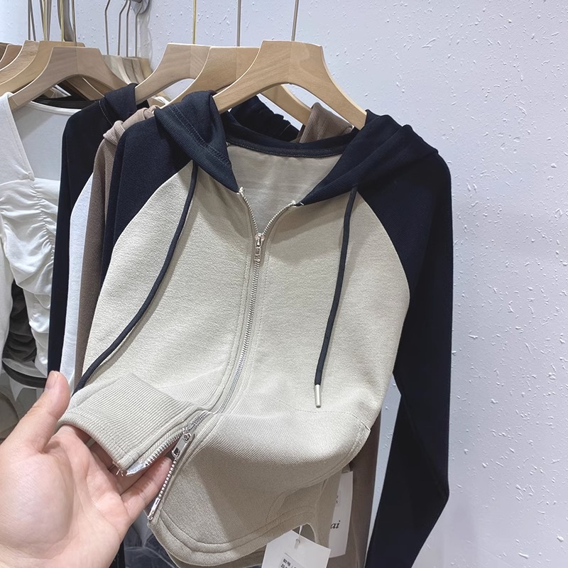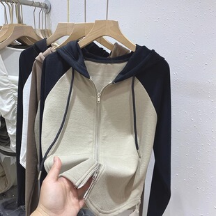 外套长袖 撞色拼接插肩袖 拉链开衫 新款 上衣 连帽T恤女2023年早秋装