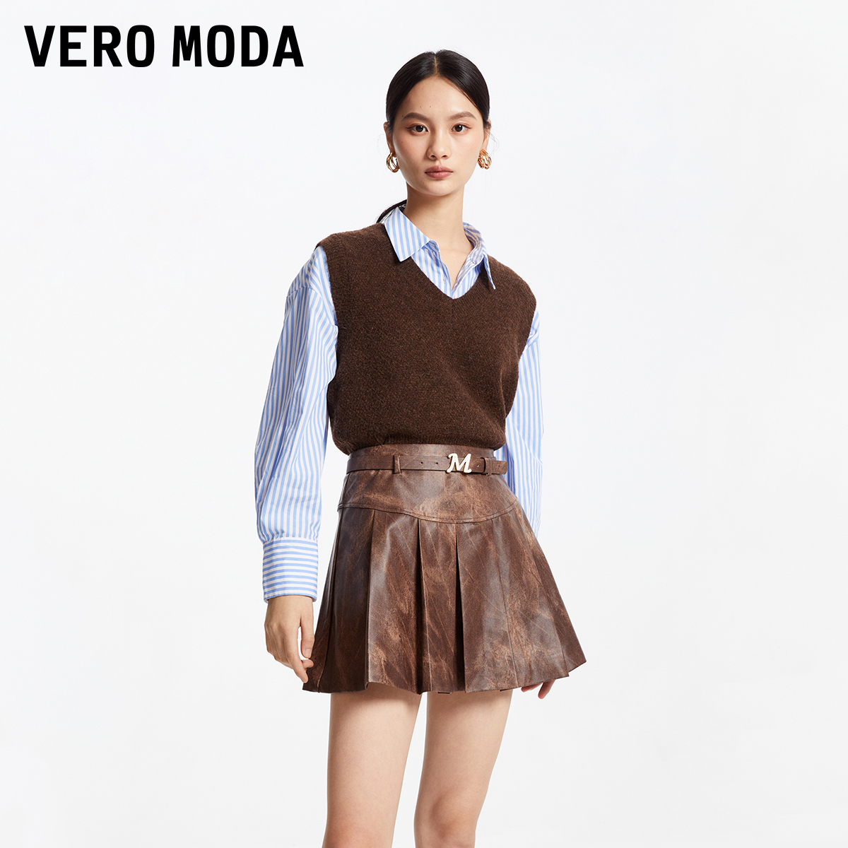 Vero 高腰A摆pu褶皱简约百搭纯色皮裙323416008 Moda半身裙25夏季