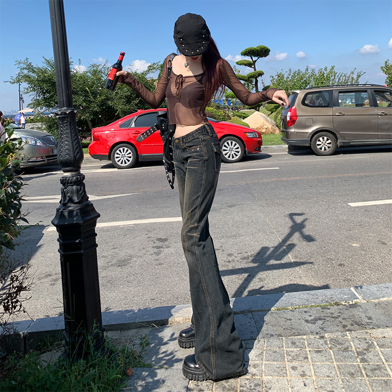 显瘦高街辣妹阔腿拖地裤 女2025新款 复古低腰微喇叭牛仔裤 KRO美式