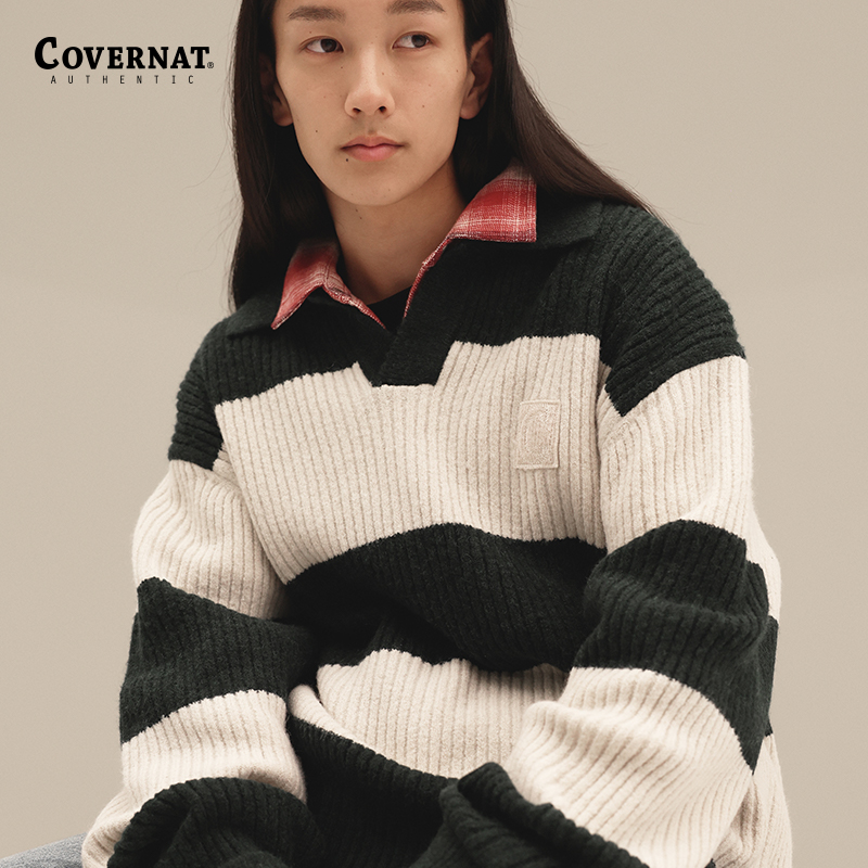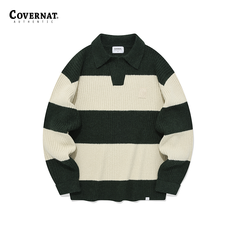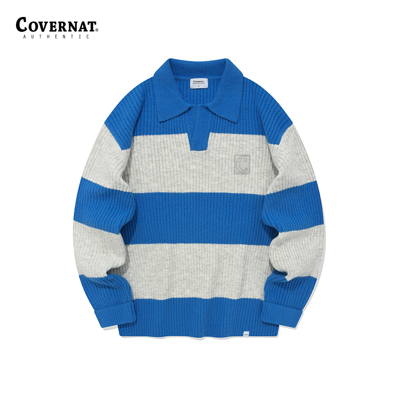 外套毛衣 情侣款 Covernat秋季 休闲宽松百搭翻领配色条纹领子针织衫