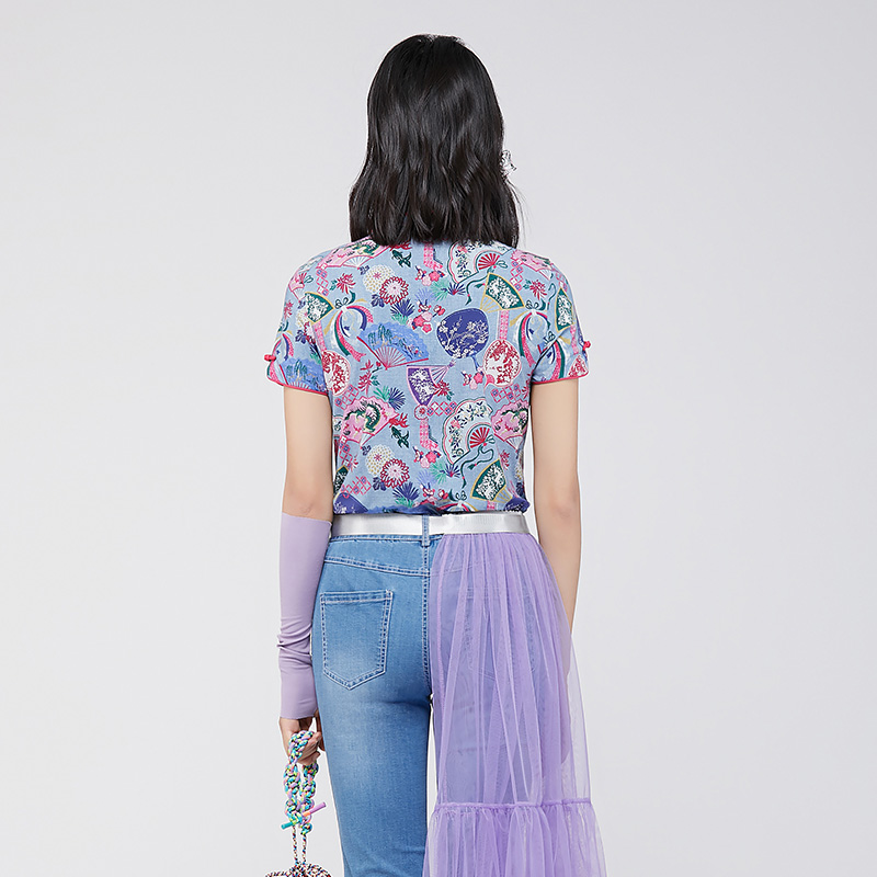 中式 渔牌女装 夏季 t恤女2024新款 旗袍领印花棉质上衣FGGB2051 短袖