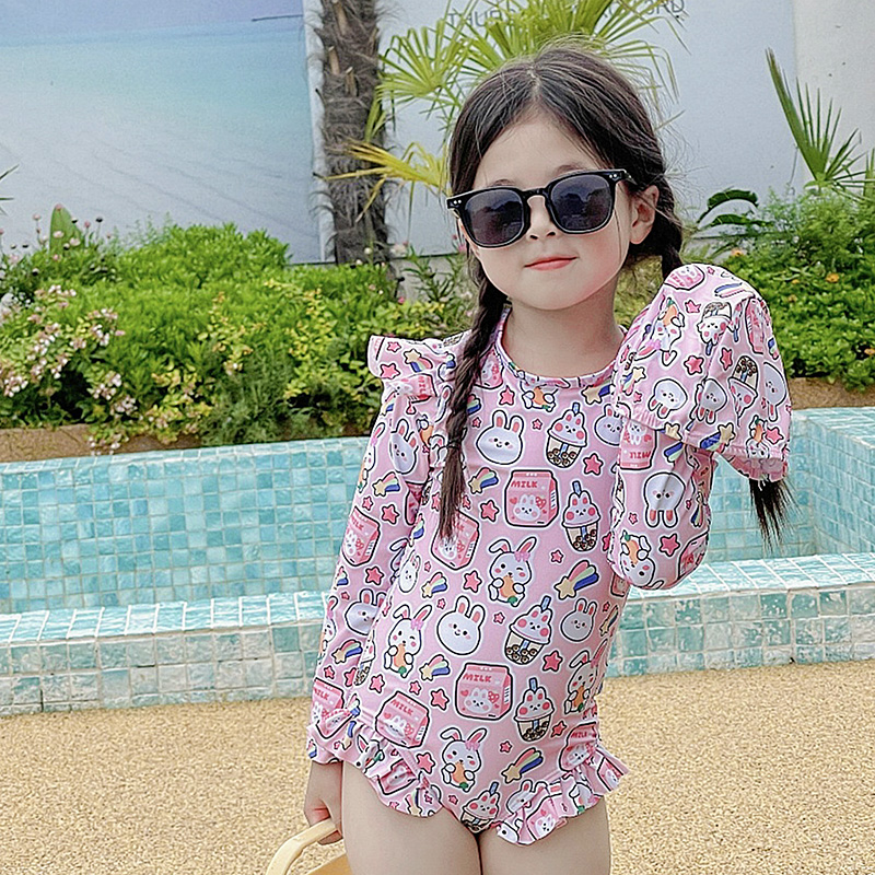 韩 卡通可爱速干游泳套装 新款 儿童泳衣女童游泳衣公主甜美连体长袖