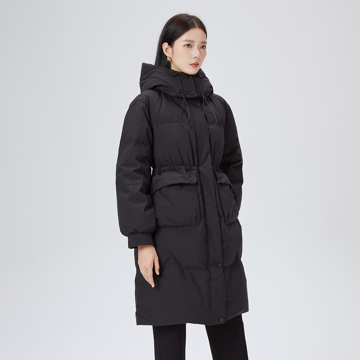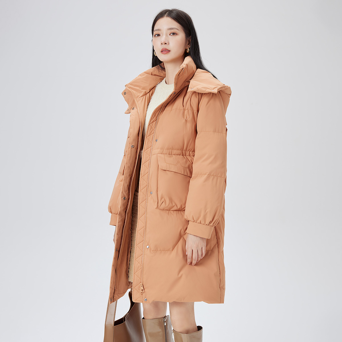 艾莱依新款 外套 羽绒服女简约百搭连帽中长款