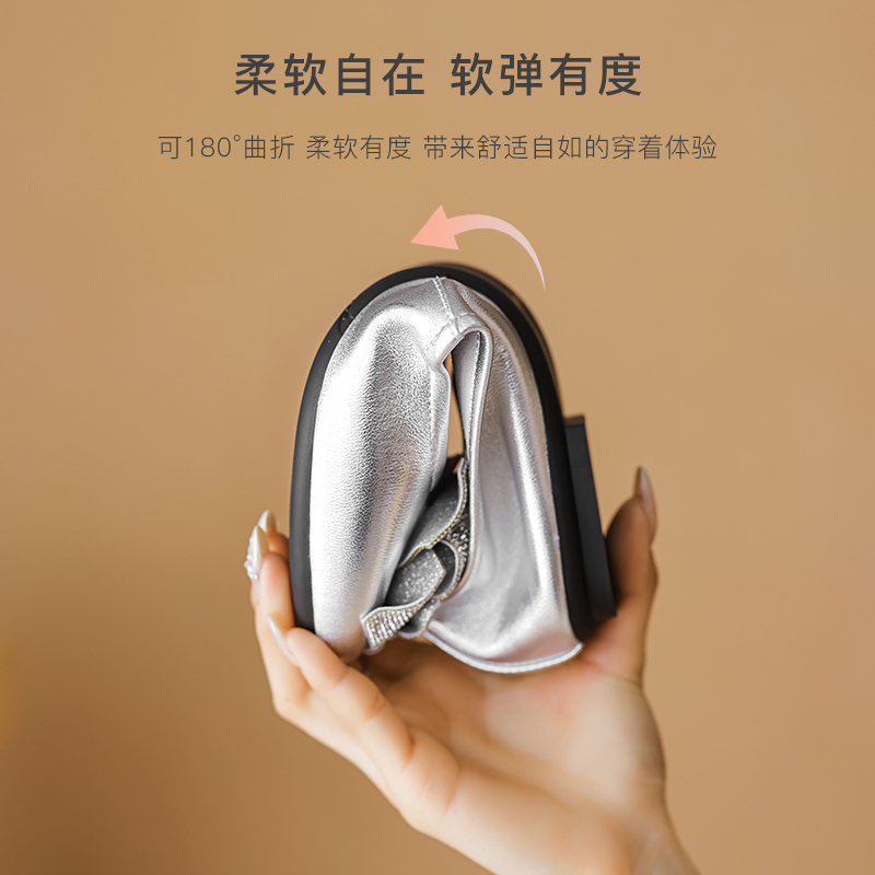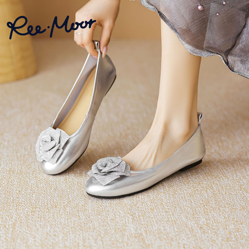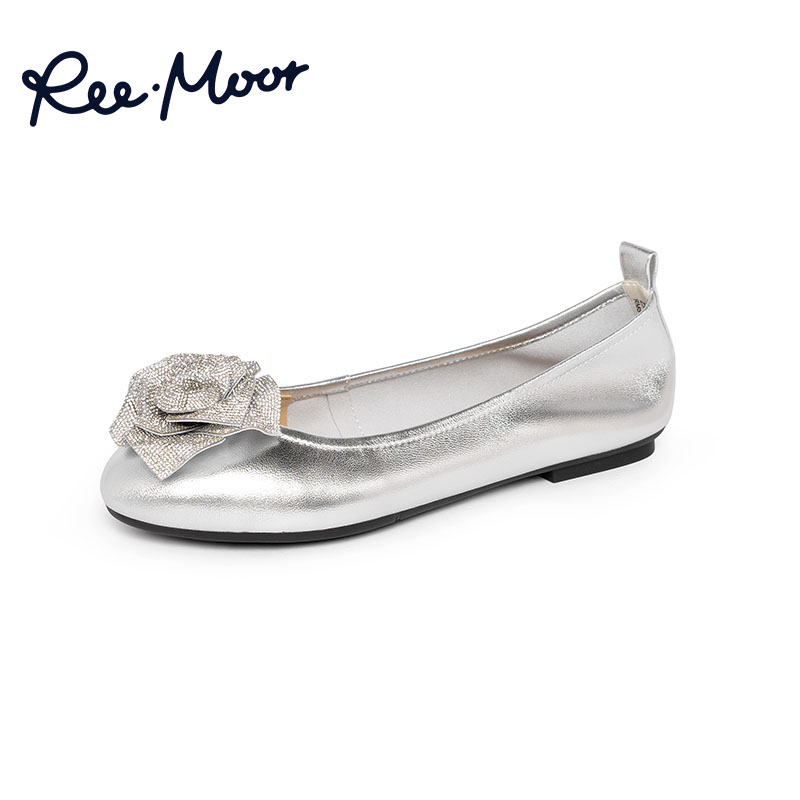女鞋 REEMOOR睿慕2025年秋季 圆头软底气质单鞋 银色真皮小皮鞋 新款