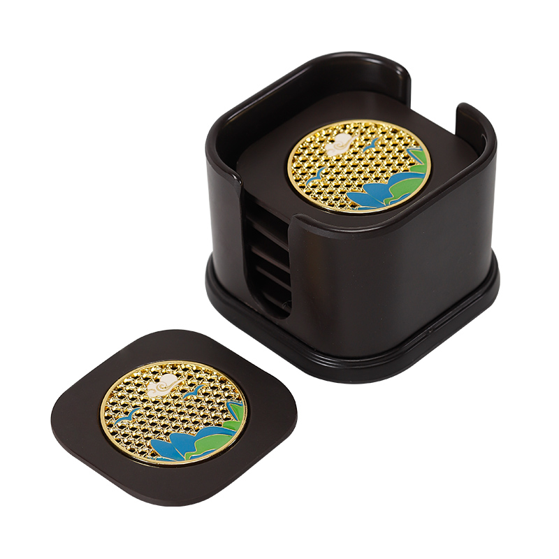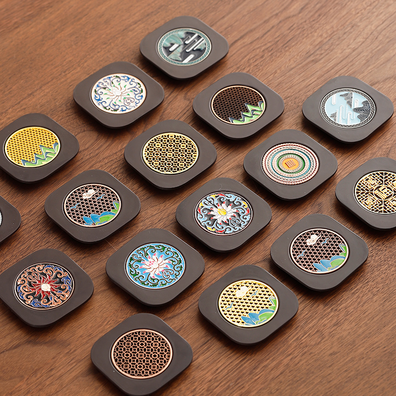 中式 电木防滑杯垫珐琅彩祥云隔热茶杯托四方家用茶道配件带收纳盒