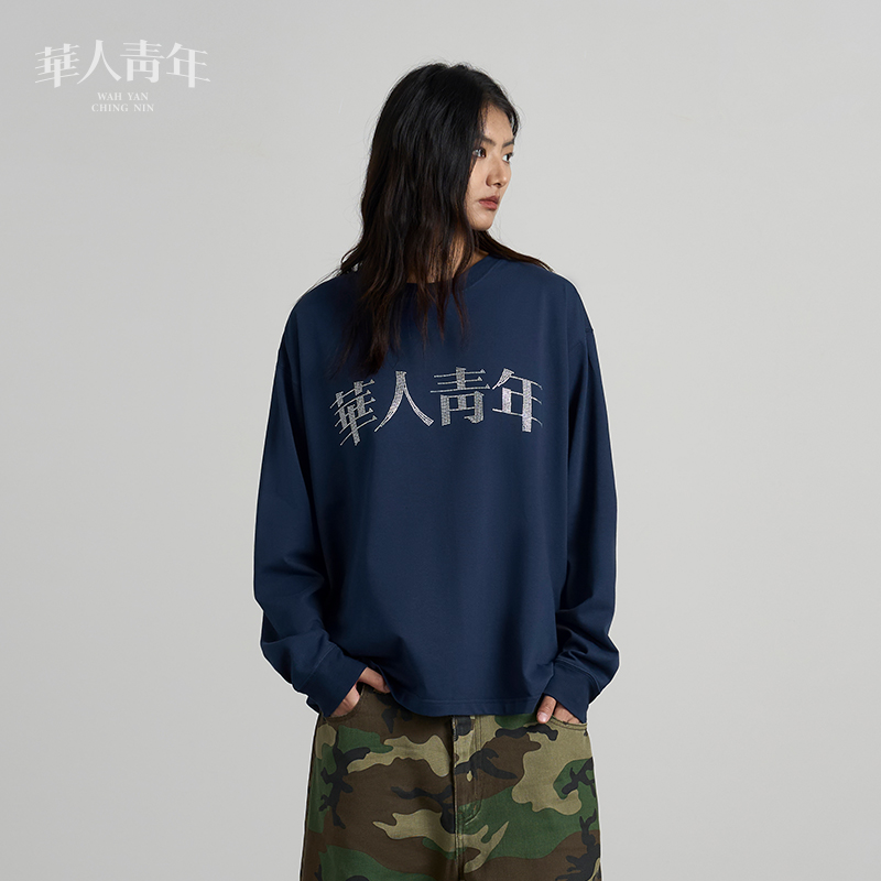 华人青年水钻长袖 T恤国潮内搭纯棉春秋男校园女情侣宽松打底衫