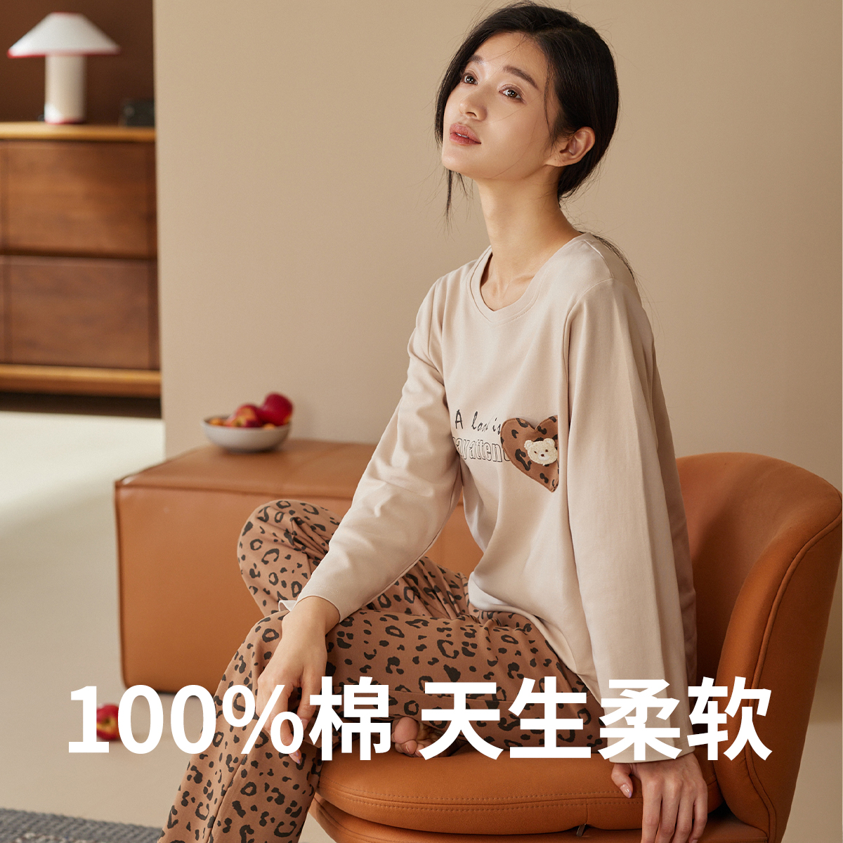 家居服套装 秋鹿柔软舒适爱心小熊印花睡衣女款 长裤 纯棉长袖 春秋季