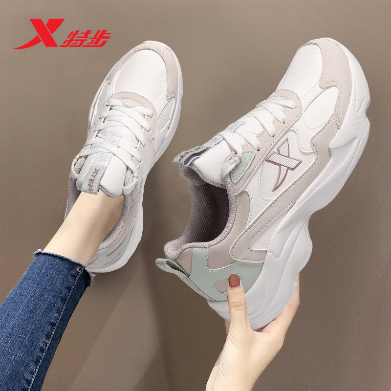 老爹鞋 新款 子皮面休闲鞋 官方旗舰正品 女 特步女鞋 轻便运动鞋 跑步鞋