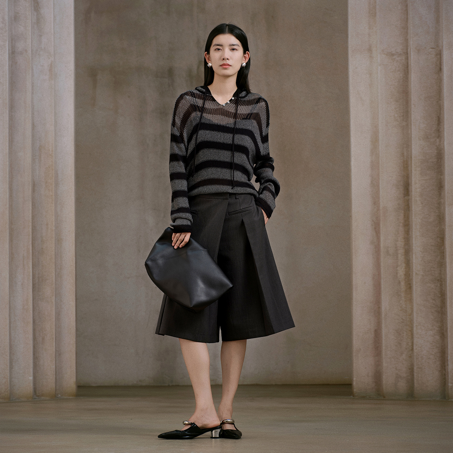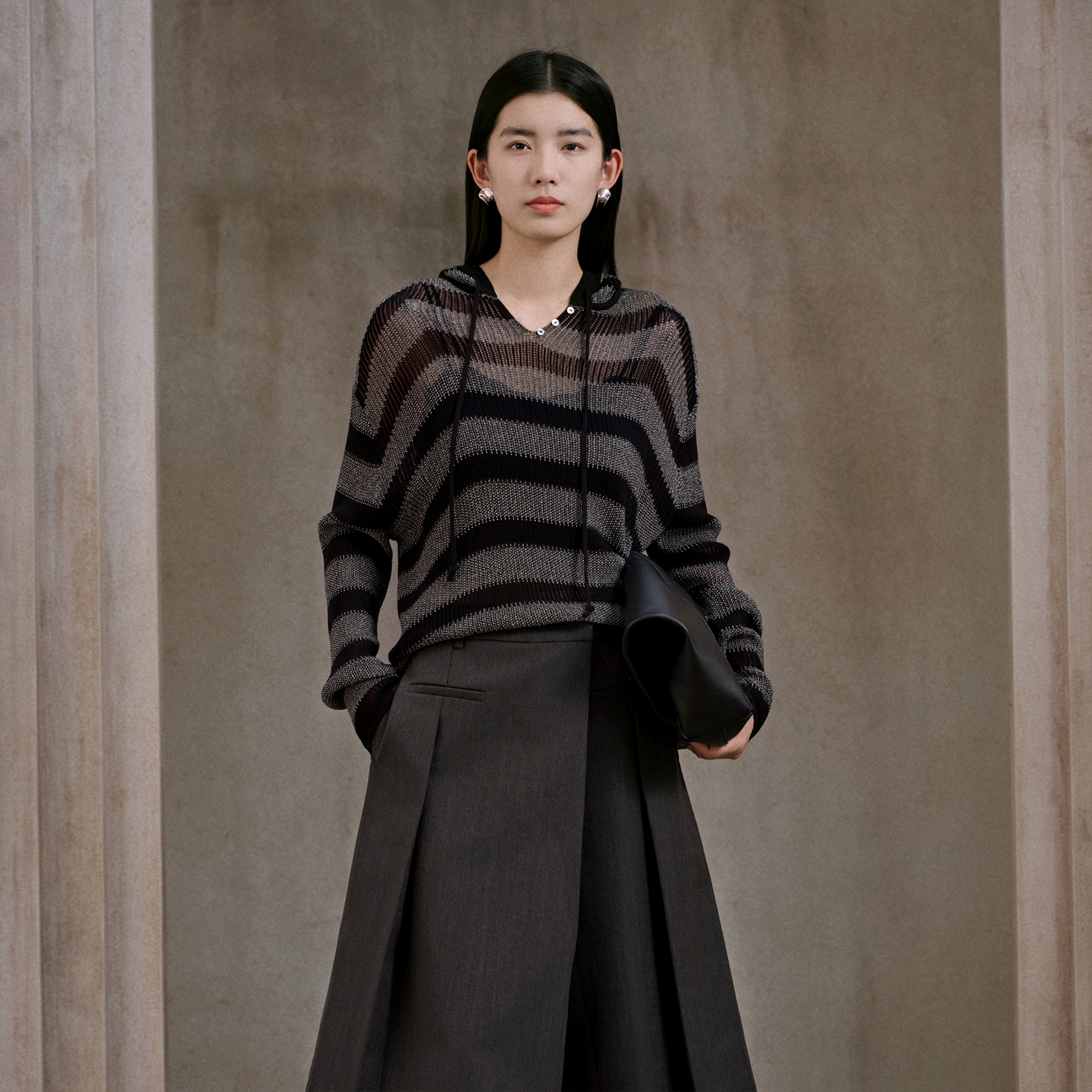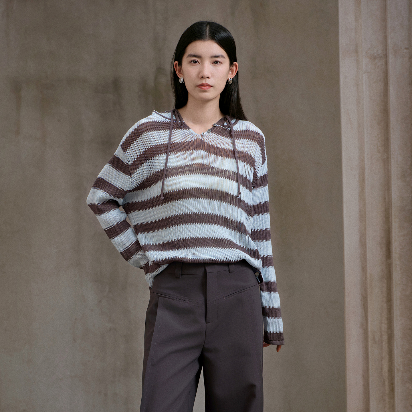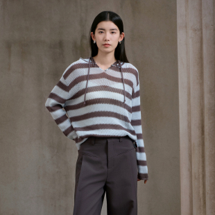 新款 女25秋季 阿依莲气质条纹针织衫 慵懒风连帽上衣 商场同款