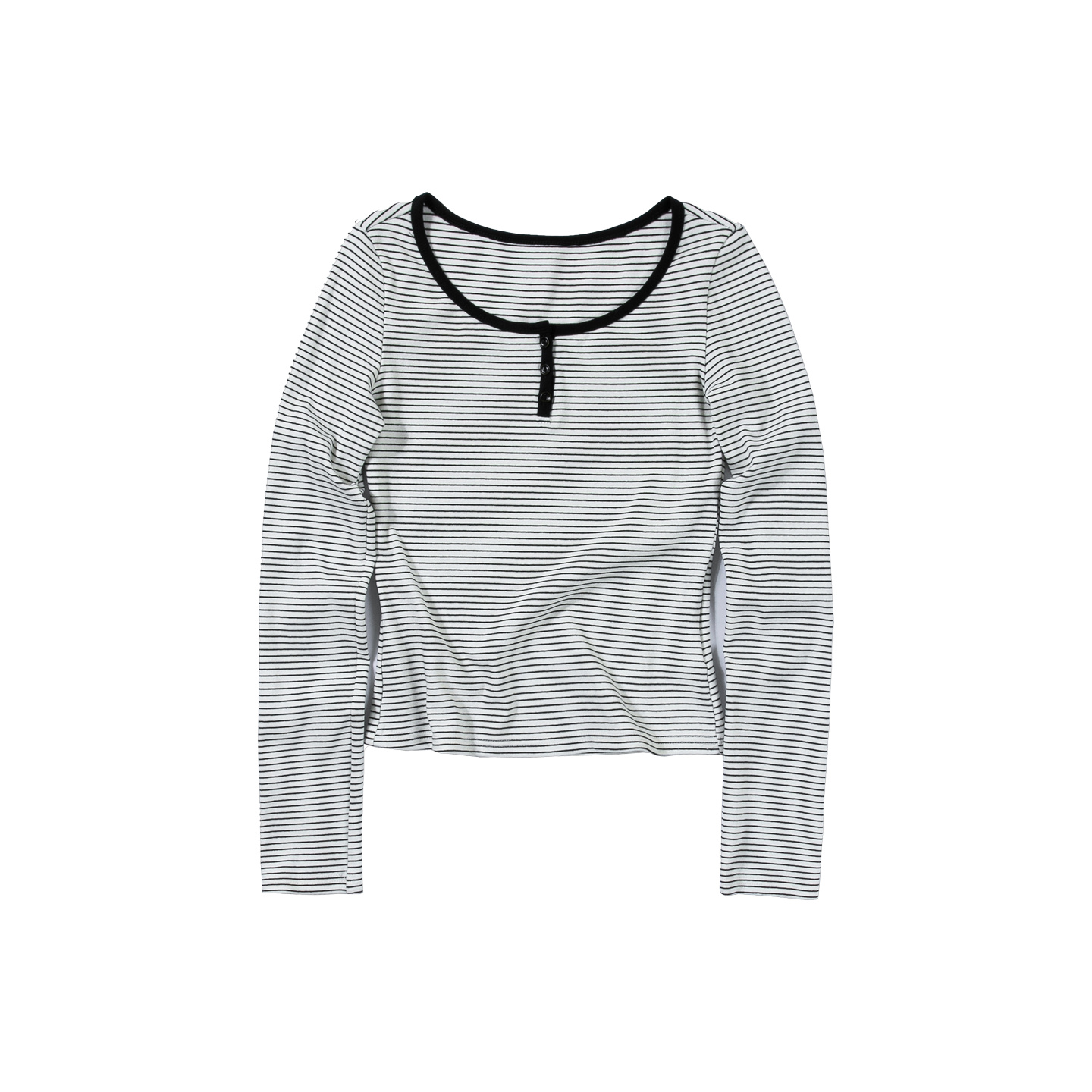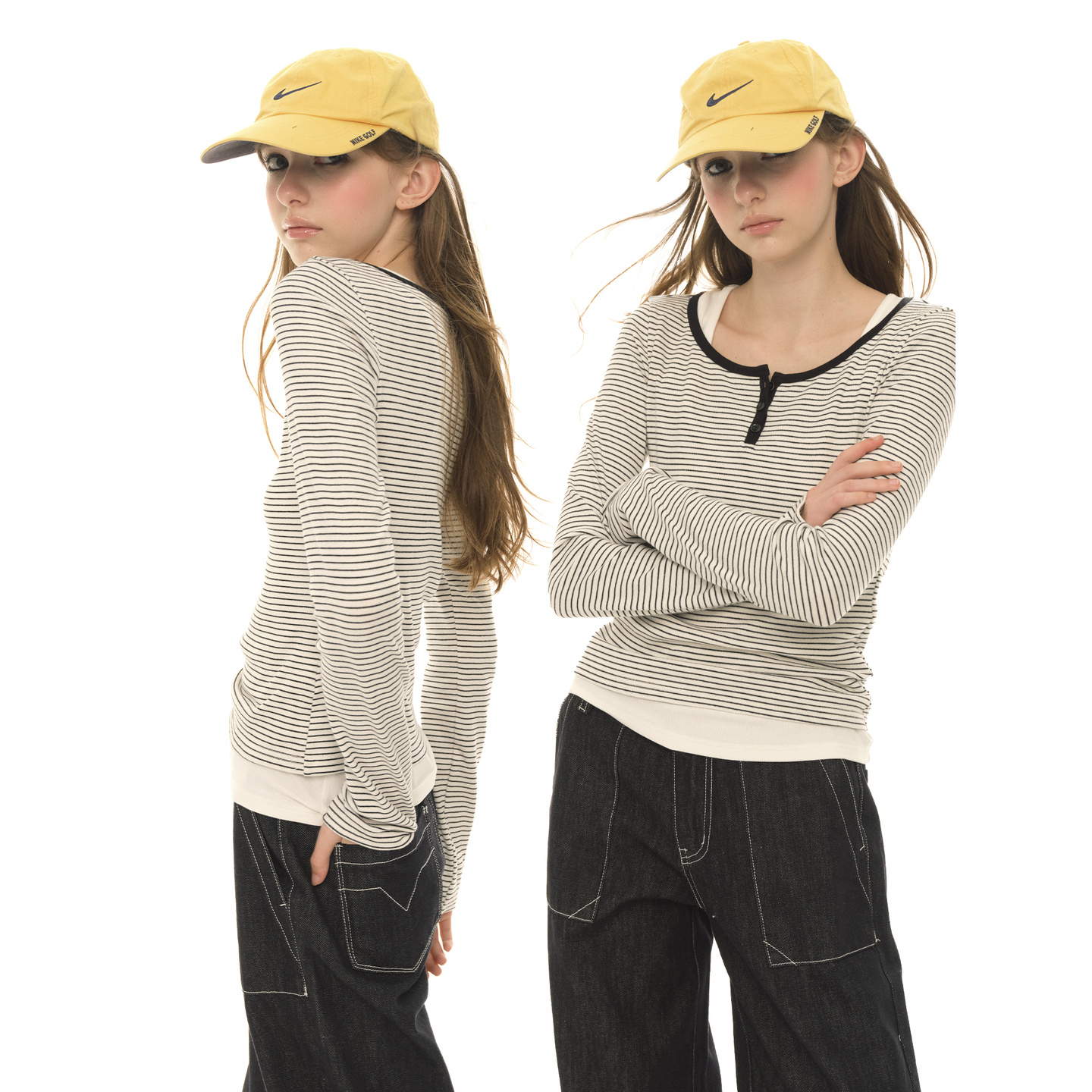 显瘦打底衫 复古辣妹风修身 T恤女秋季 UNRETRO亨利领黑白条纹长袖