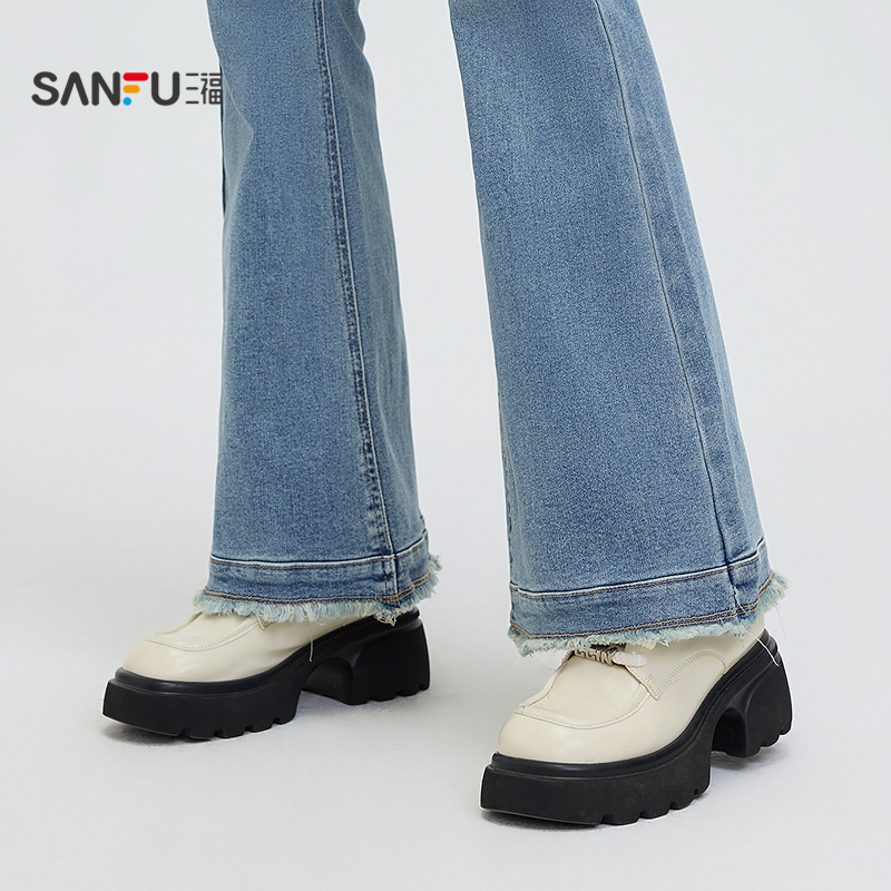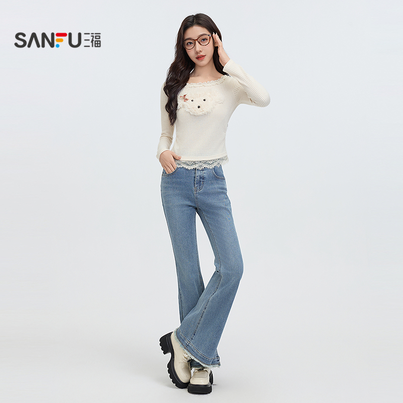 子女装 三福牛仔长裤 毛边设计复古浅蓝微喇叭裤 秋季 496222 2025新款