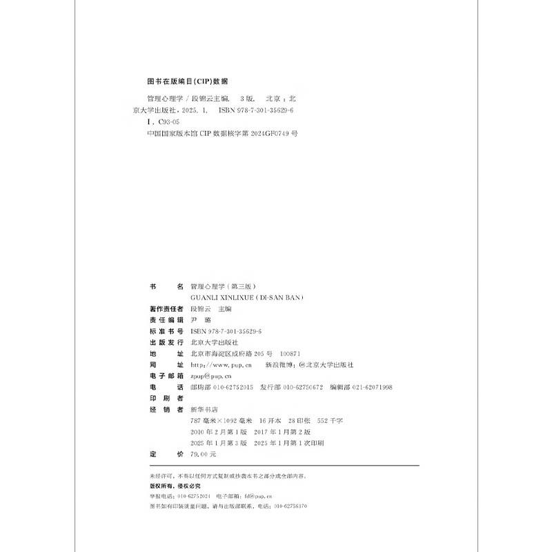 2025新书 北京大学出版 管理心理学 段锦云 社9787301356296 第三版 正版