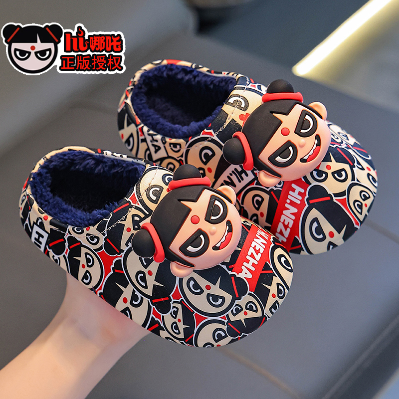 卡通可爱防水防滑室内软底男孩宝宝拖鞋 哪吒儿童棉拖鞋 女童冬季