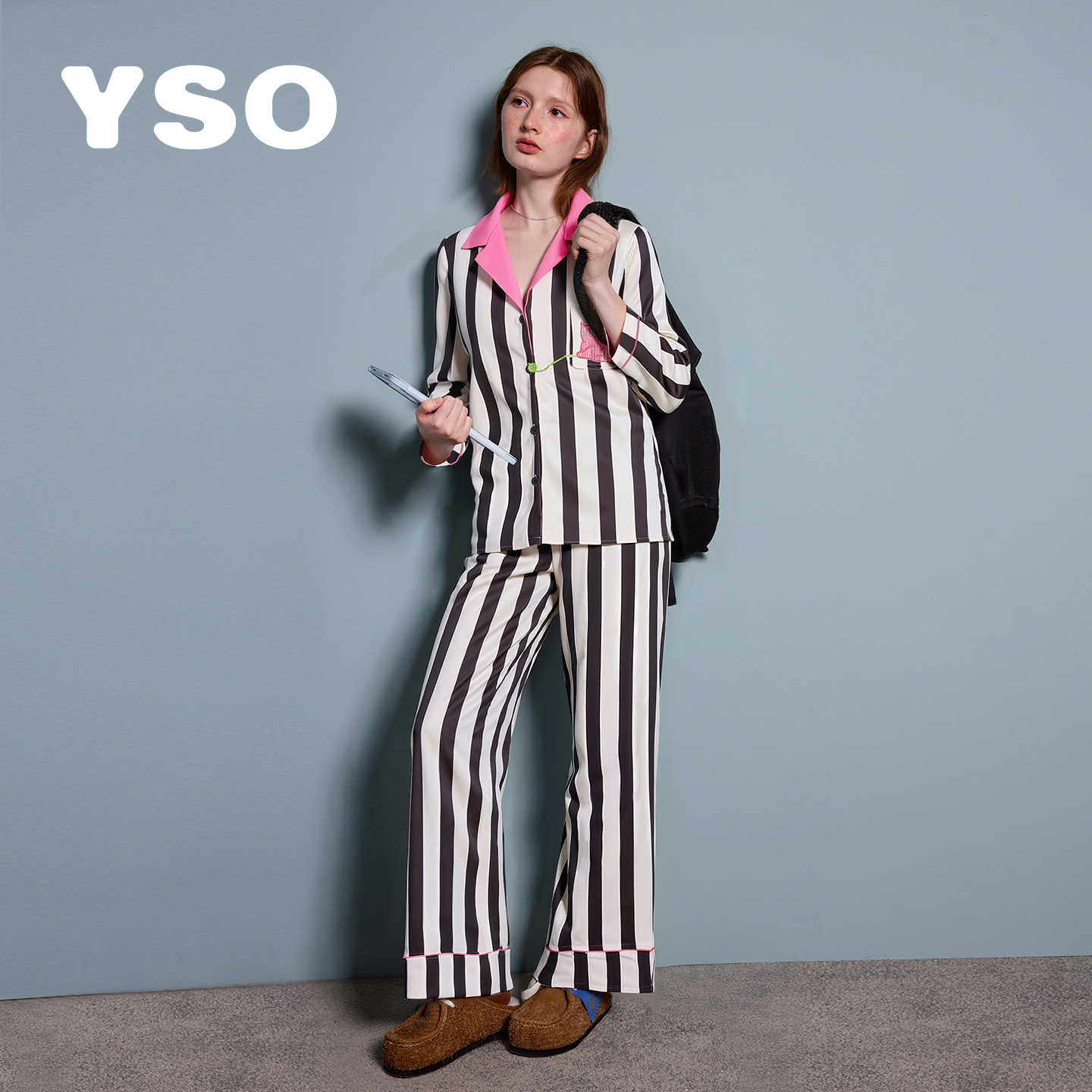 黑白条纹满印酷猫翻领家居服套装 睡衣女春秋新款 酷猫系列 yso