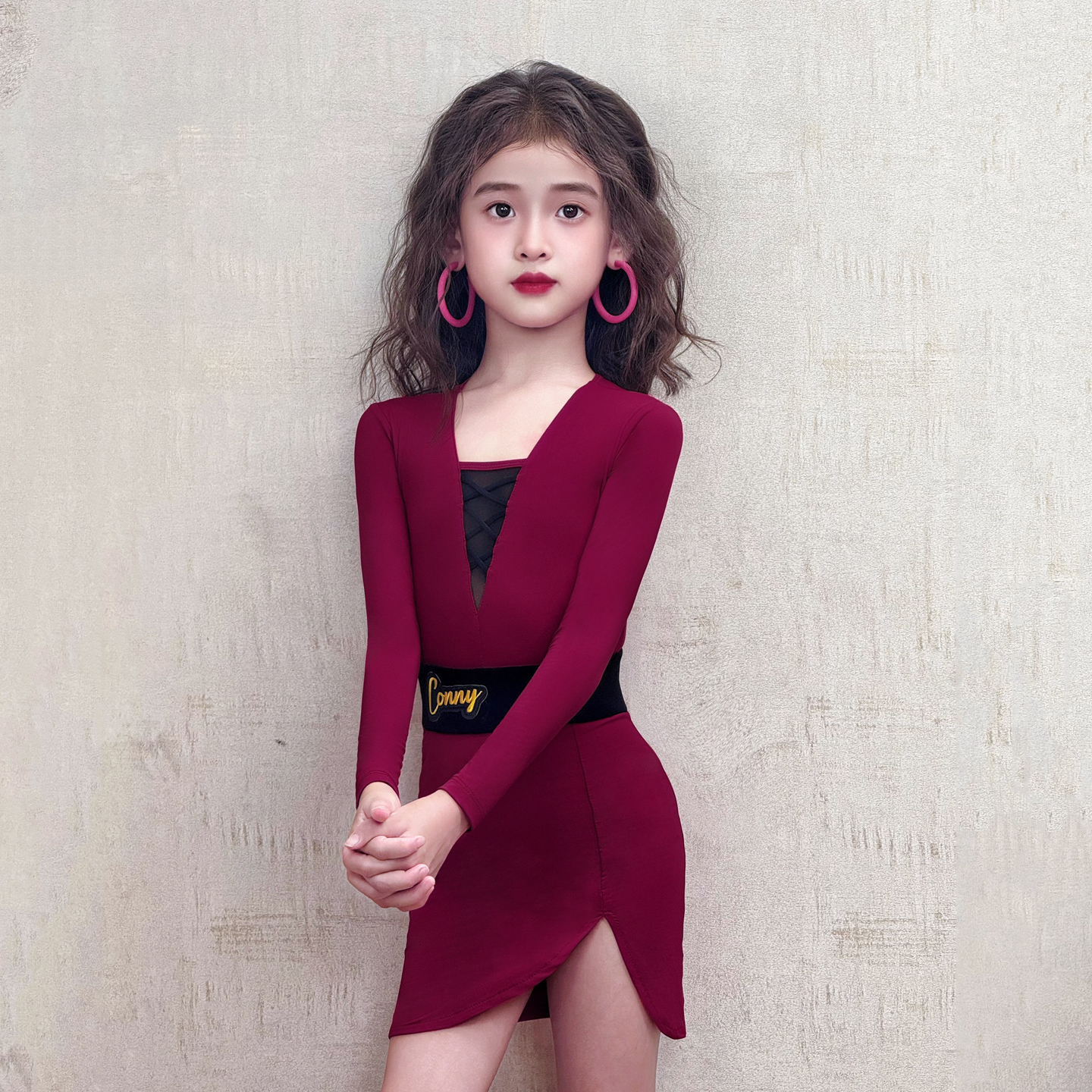 CONNY秋冬拉丁舞服装 女儿童跳舞蹈练功训练服连衣裙表演出服长袖
