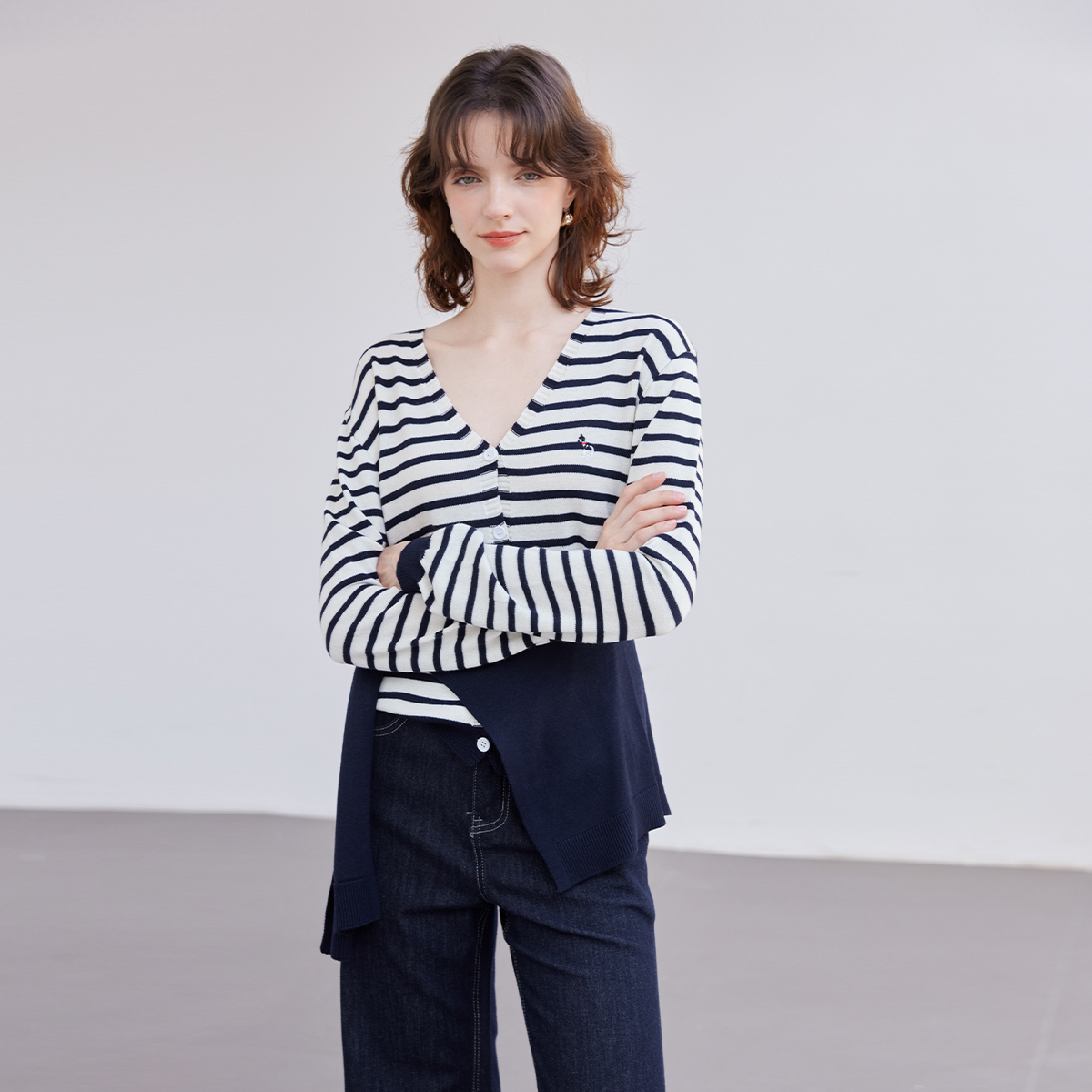 上衣休闲百搭针织衫 纳纹25秋季 披肩条纹撞色针织开衫 时尚 女 秋款