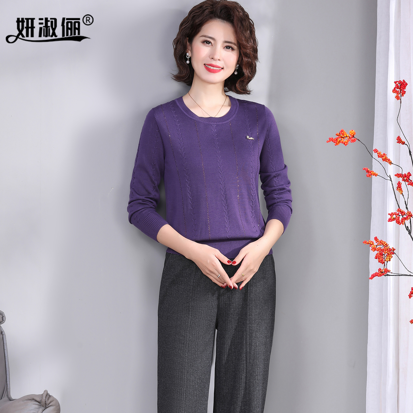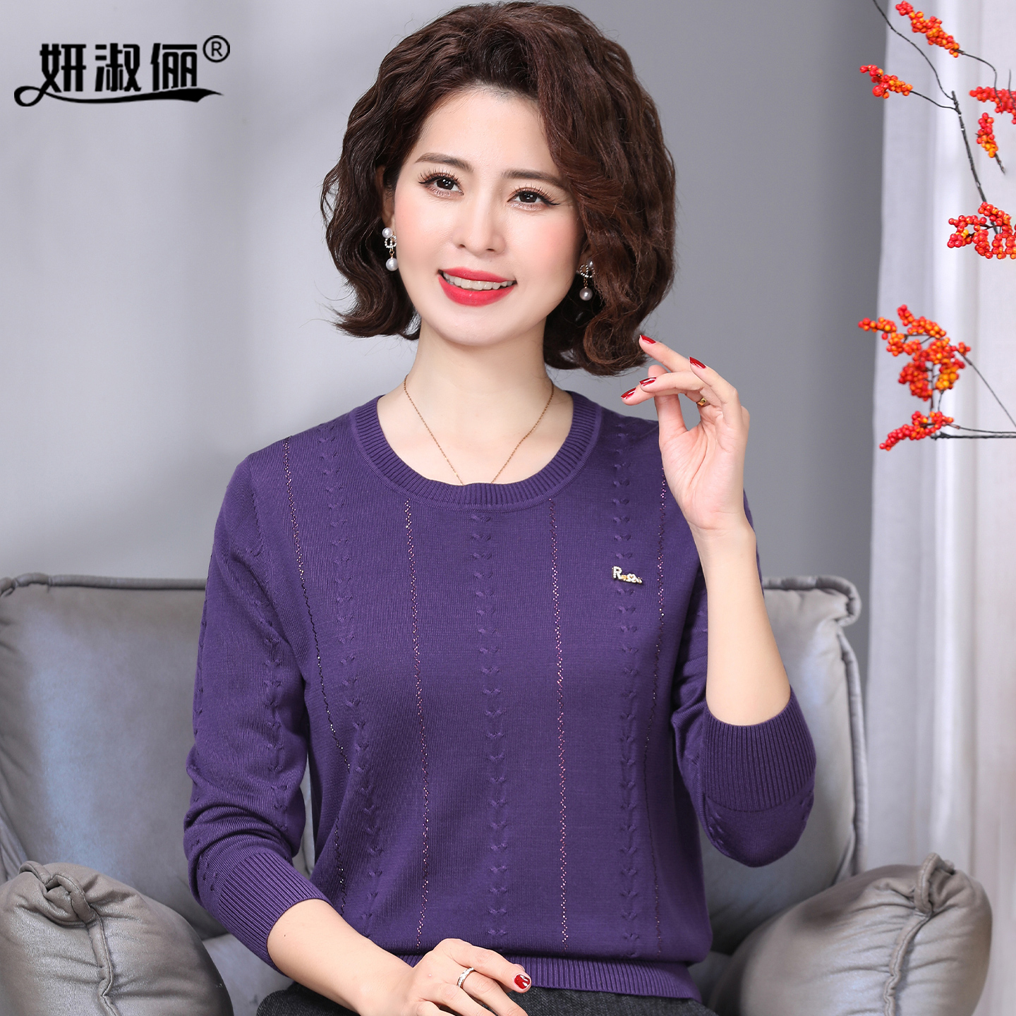 年轻洋气上衣小衫 50岁妈妈秋季 天丝套装 高级感2025新款 圆领针织衫