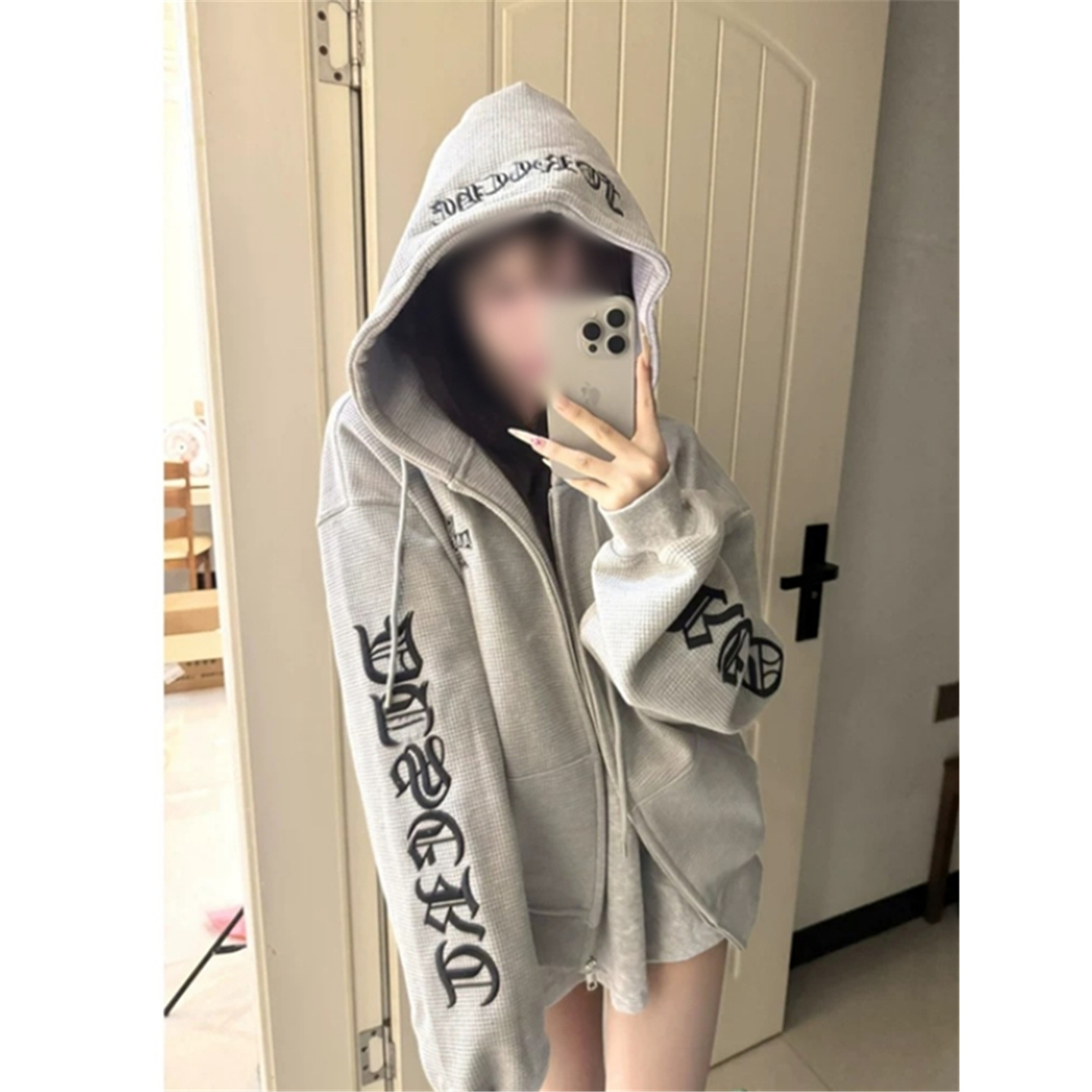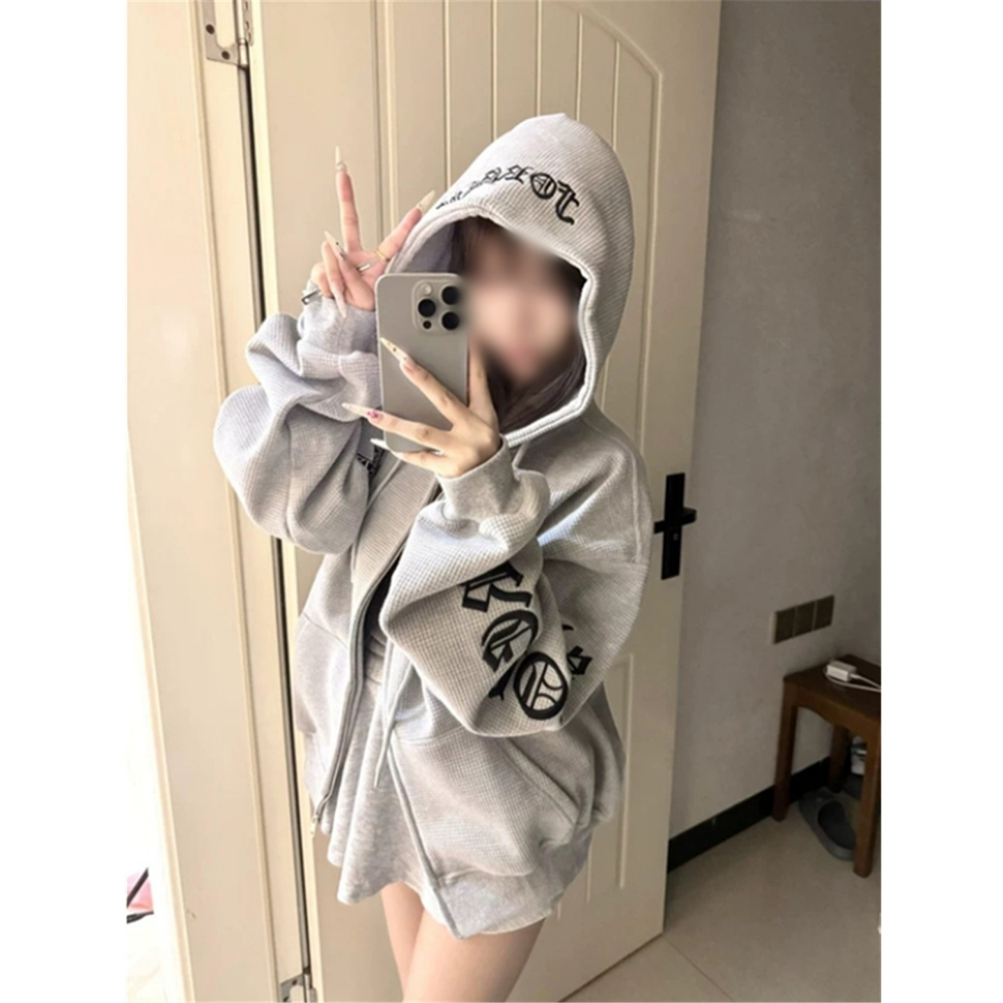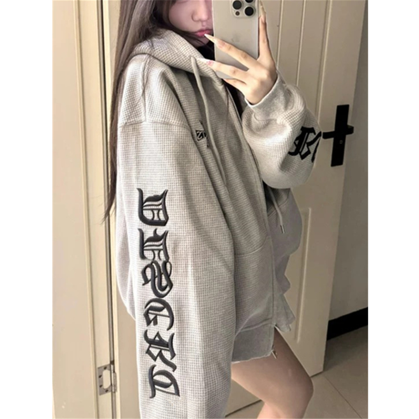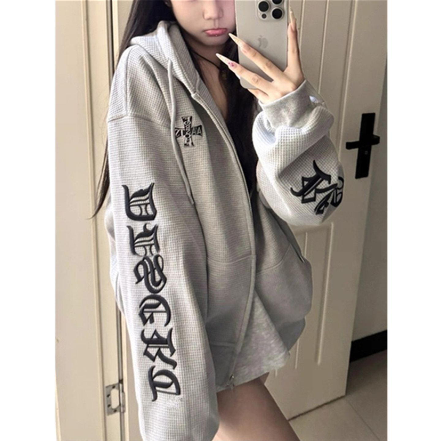 上衣 外套宽松慵懒开衫 美式 潮牌华夫格连帽卫衣女春秋oversize薄款