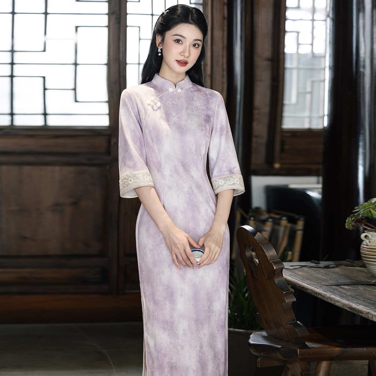 连衣裙女夏高级感开叉长裙旗袍 人丝肌理提花新中式 JKJS 幽兰影