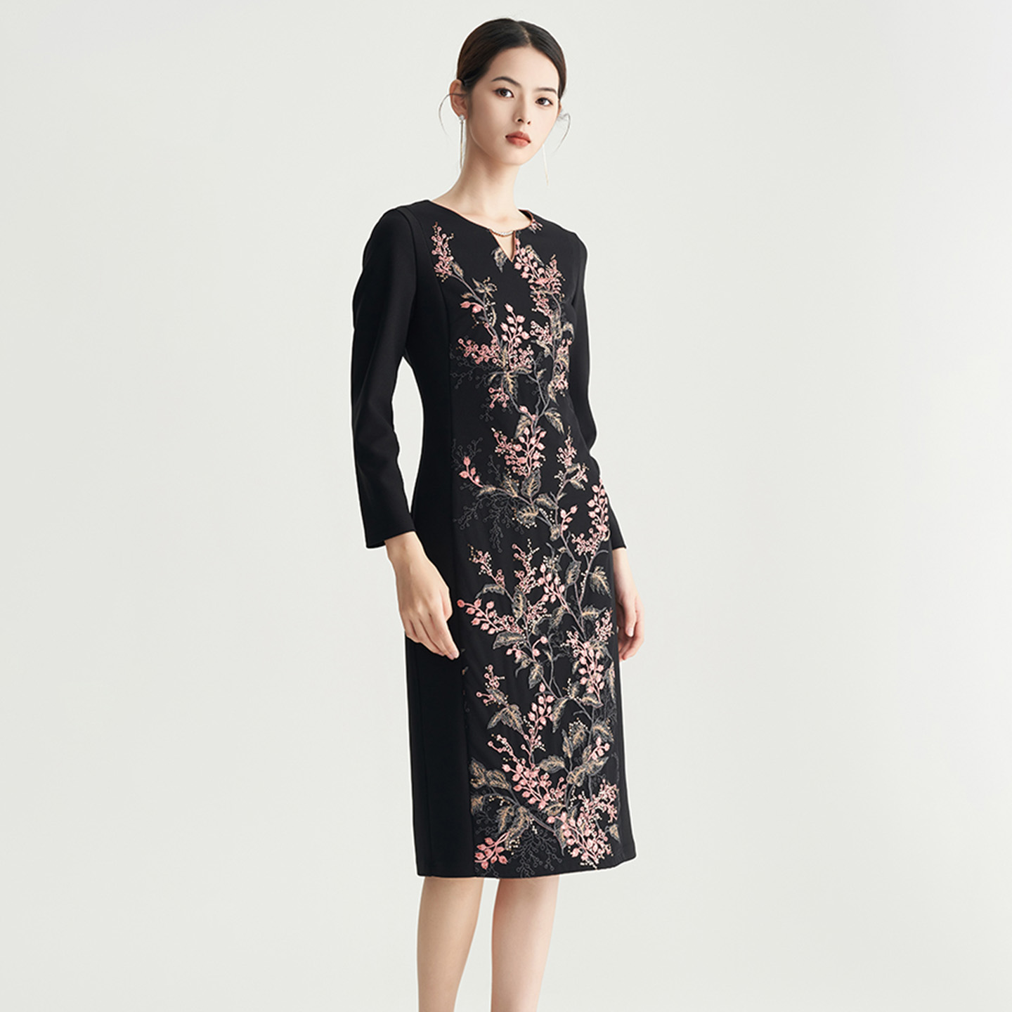 法式 刺绣连衣裙子修身 气质女 黑底粉花圆领长袖 马天奴2025秋冬新款