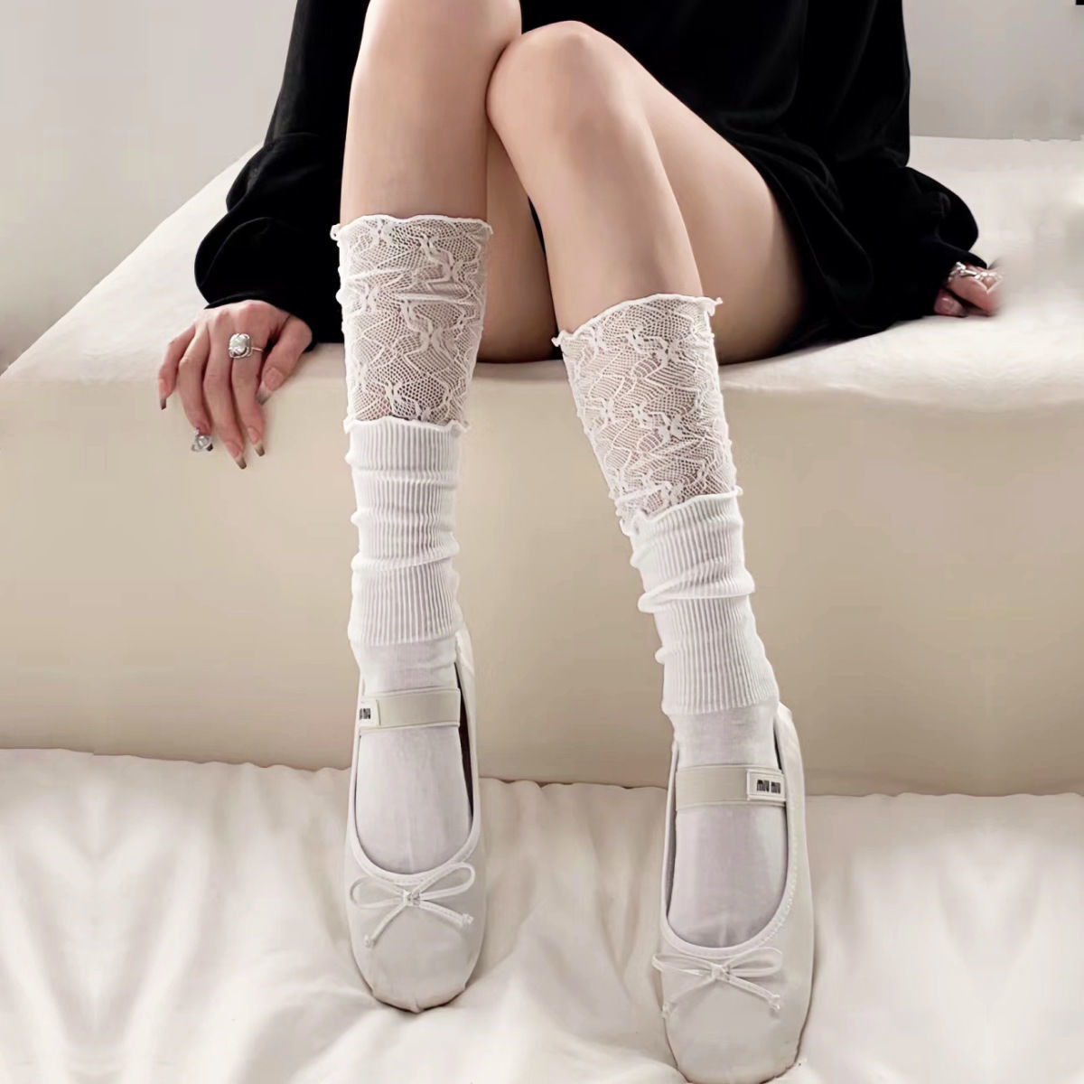 薄款 夏季 无骨月子袜花边中筒袜搭配小皮鞋 白色袜子女堆堆袜春秋季