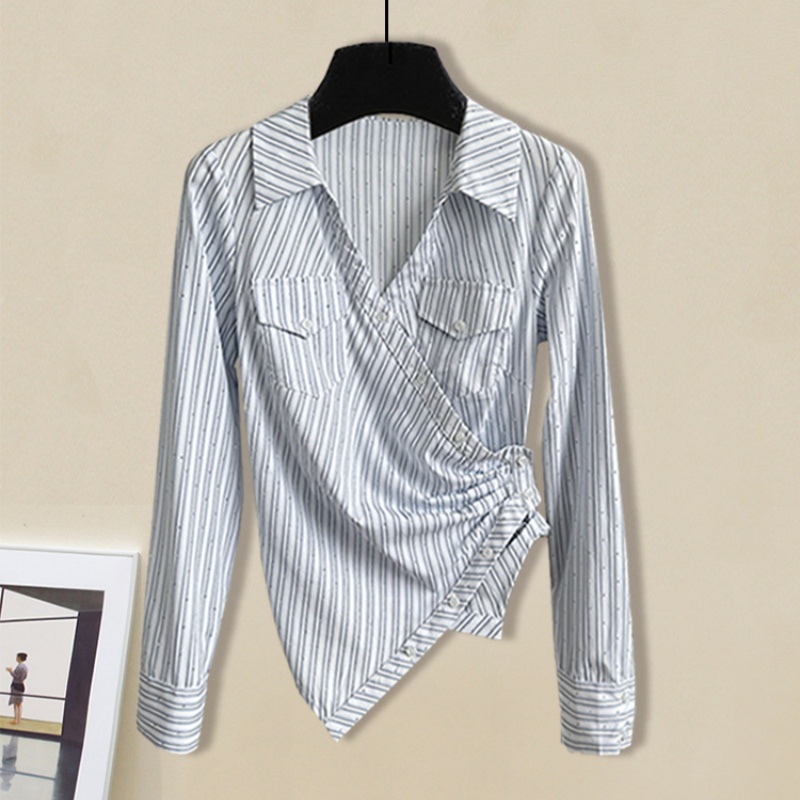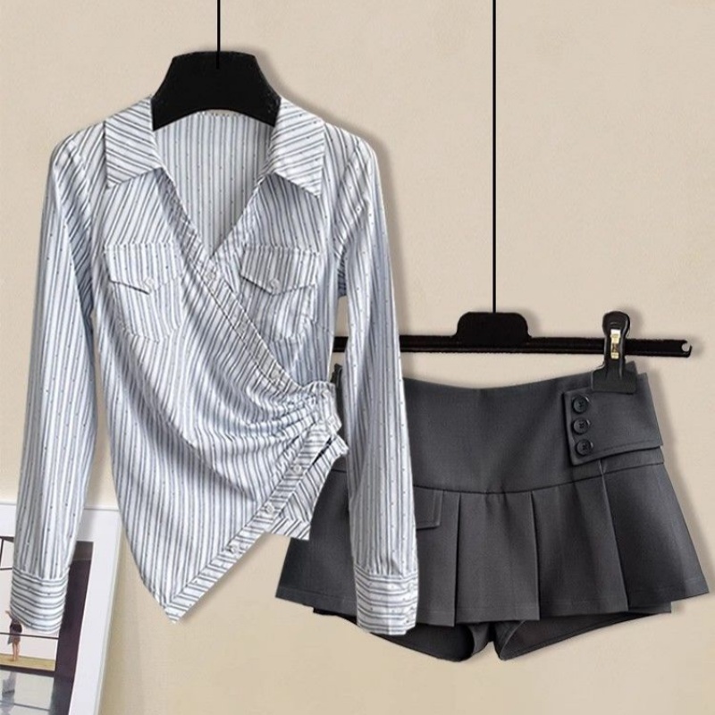 新款 v领衬衫 大码 百搭显瘦条纹长袖 高腰显瘦半身裙女 时尚 2025秋季