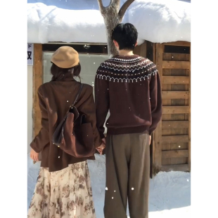 韩系慵懒风毛衣圆领打底上衣 秋冬季 民族风费尔岛提花针织衫 男女款