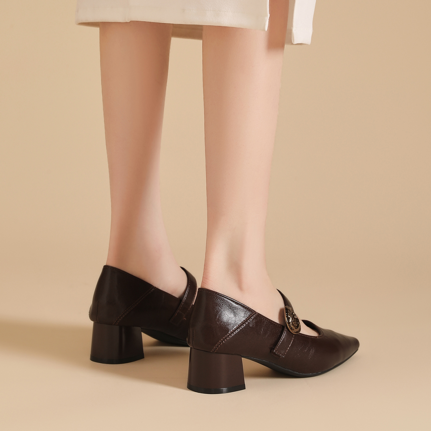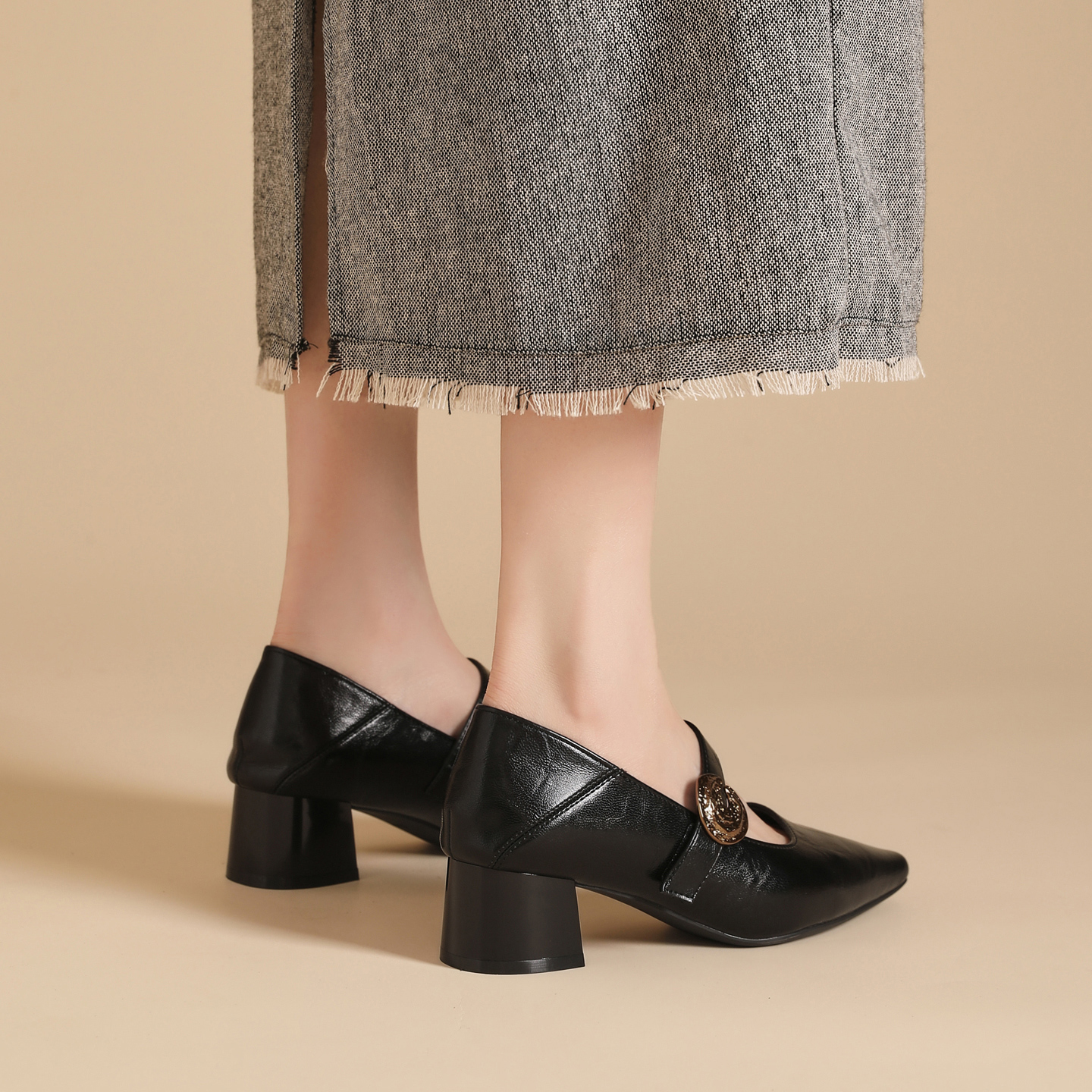 新款 康莉春季 高跟单鞋 女方头真皮通勤时尚 子 方扣浅口鞋 博主推荐