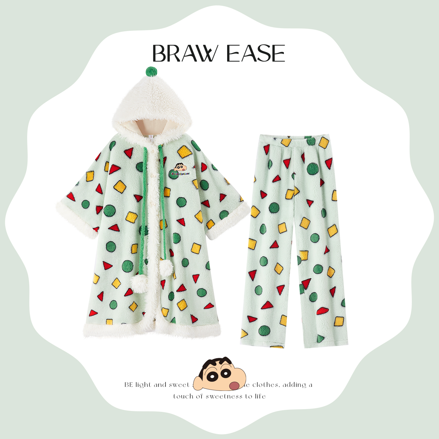蜡笔小新斗篷睡衣女珊瑚绒睡袍披肩冬季 加绒加厚连帽冬天浴袍披风