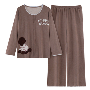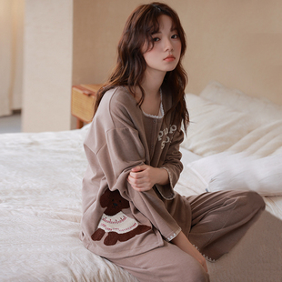 纯色全棉大码 猫人纯棉睡衣女春秋款 套装 长袖 宽松家居服 带胸垫开衫