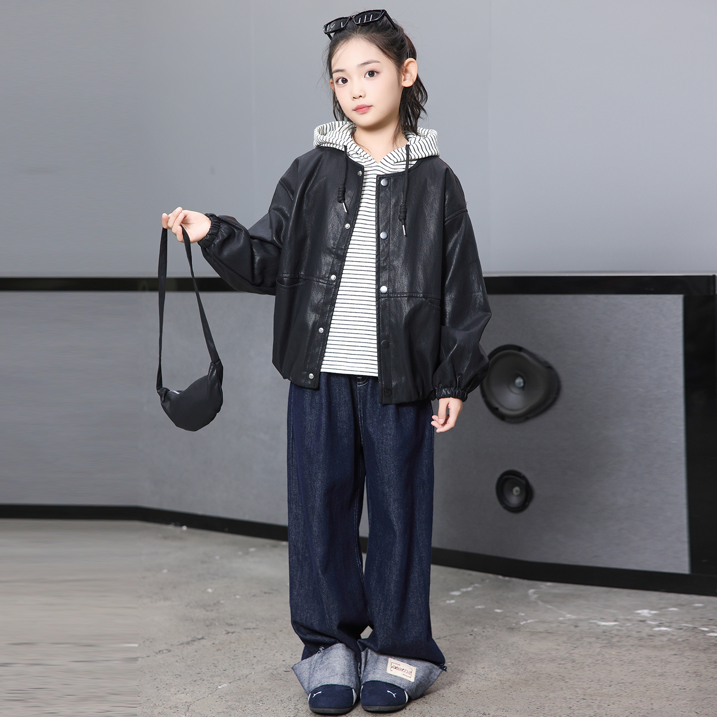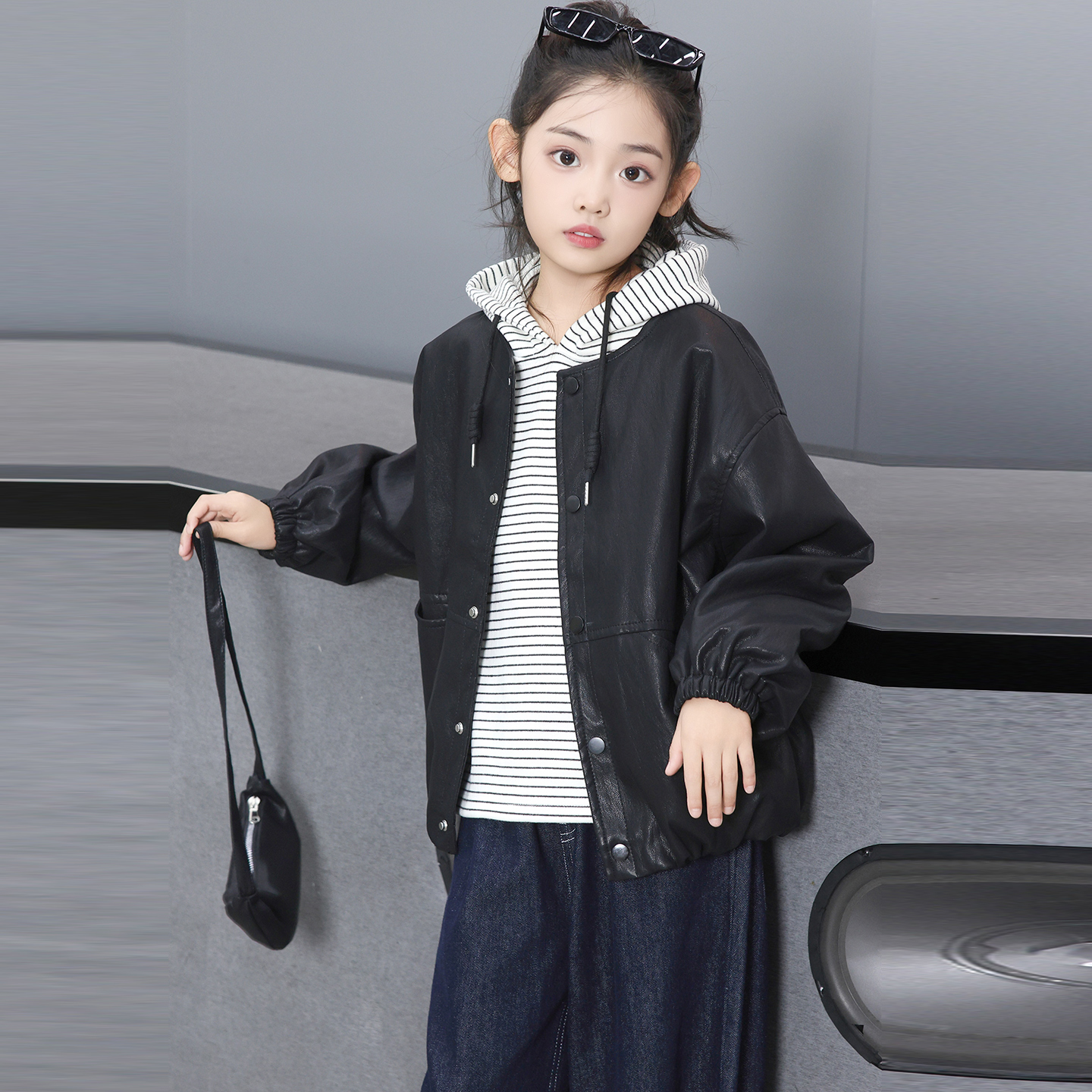 长袖 女童皮衣外套春秋款 皮衣套装 洋气小女孩帽子打底衫 潮 2025新款