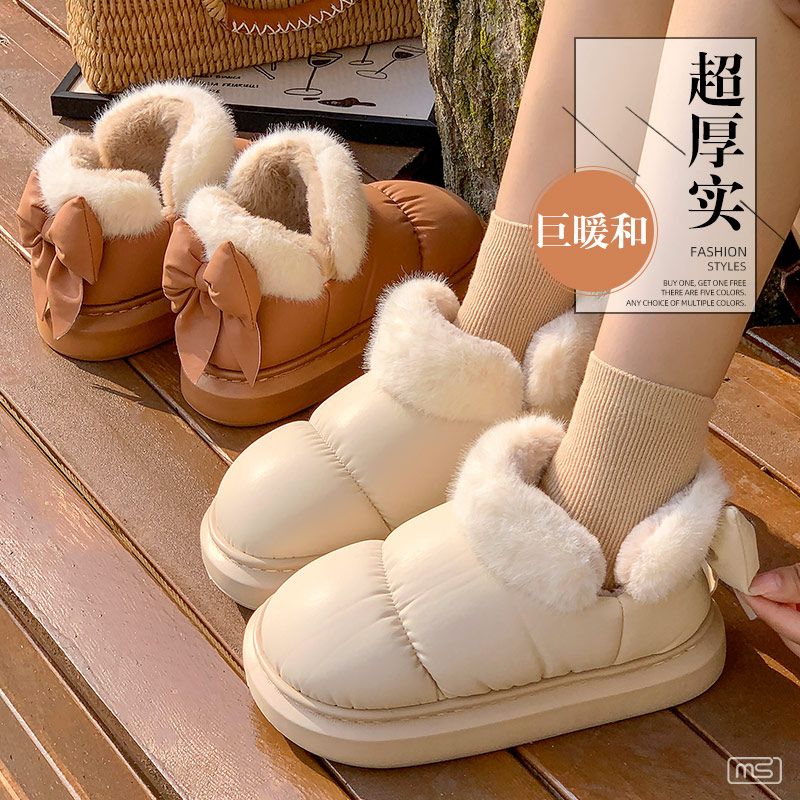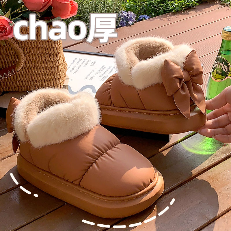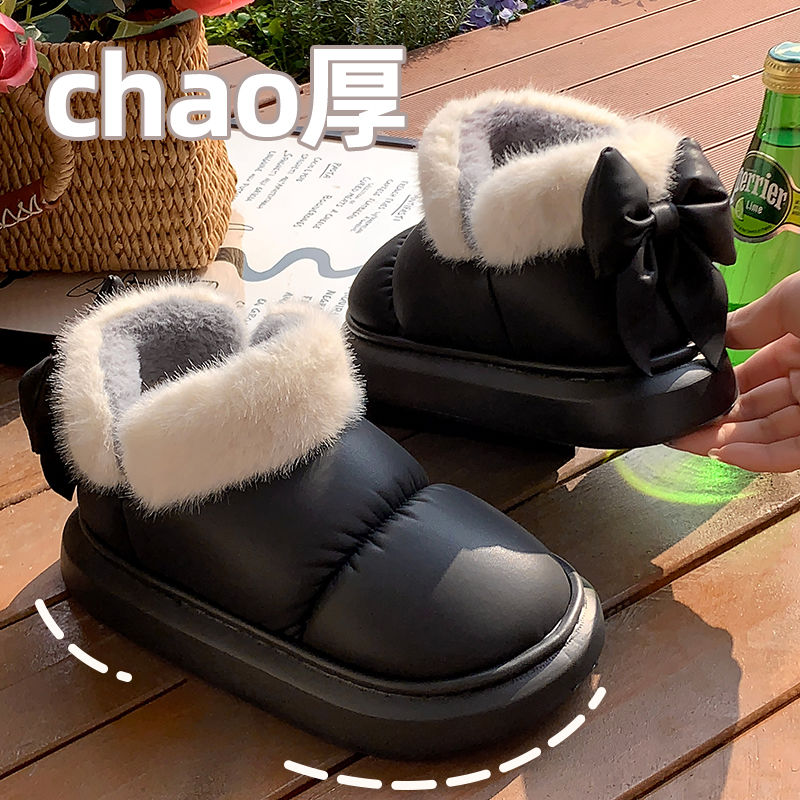 加厚加绒蝴蝶结雪地靴保暖棉鞋 2025新款 女冬季 高帮包跟厚底棉拖鞋