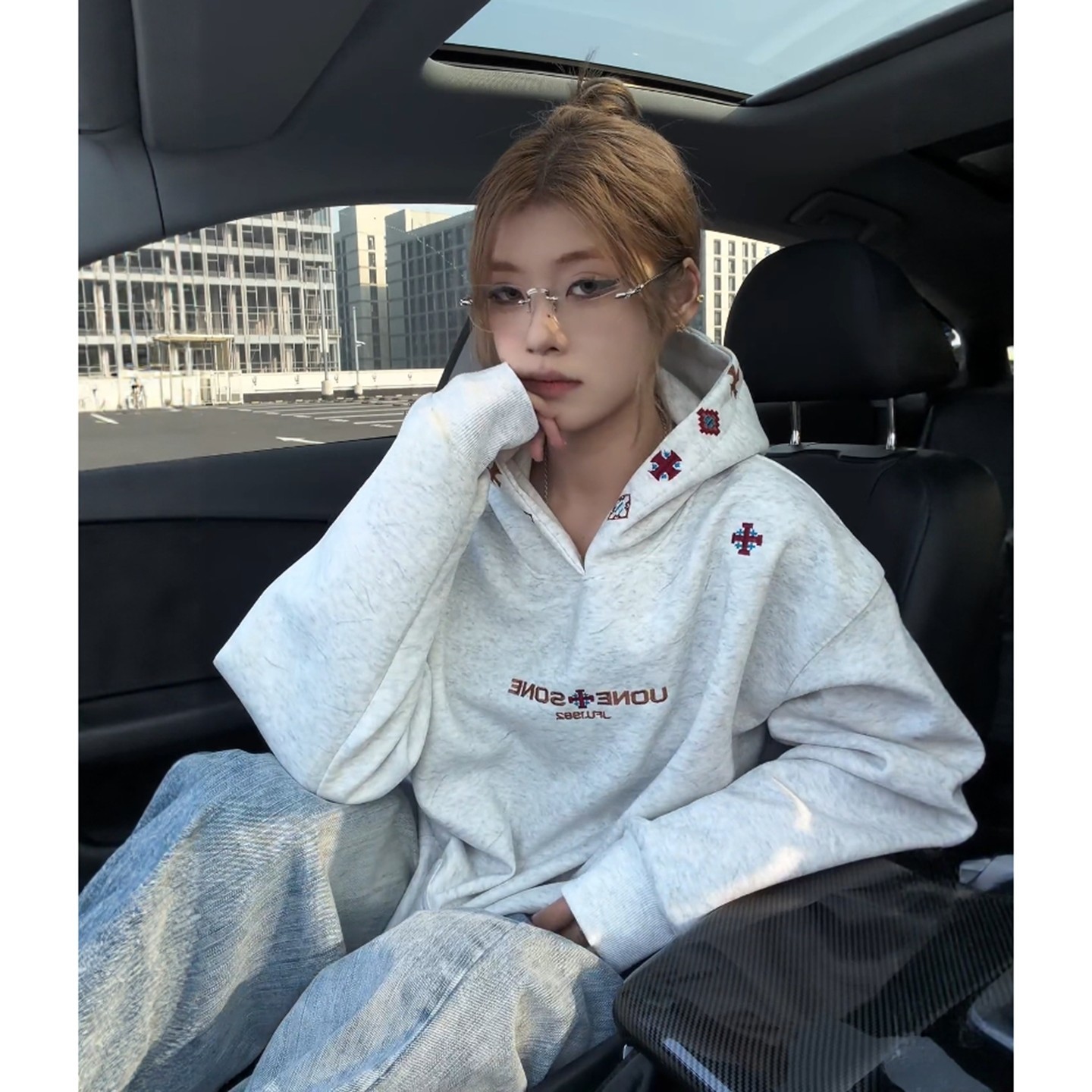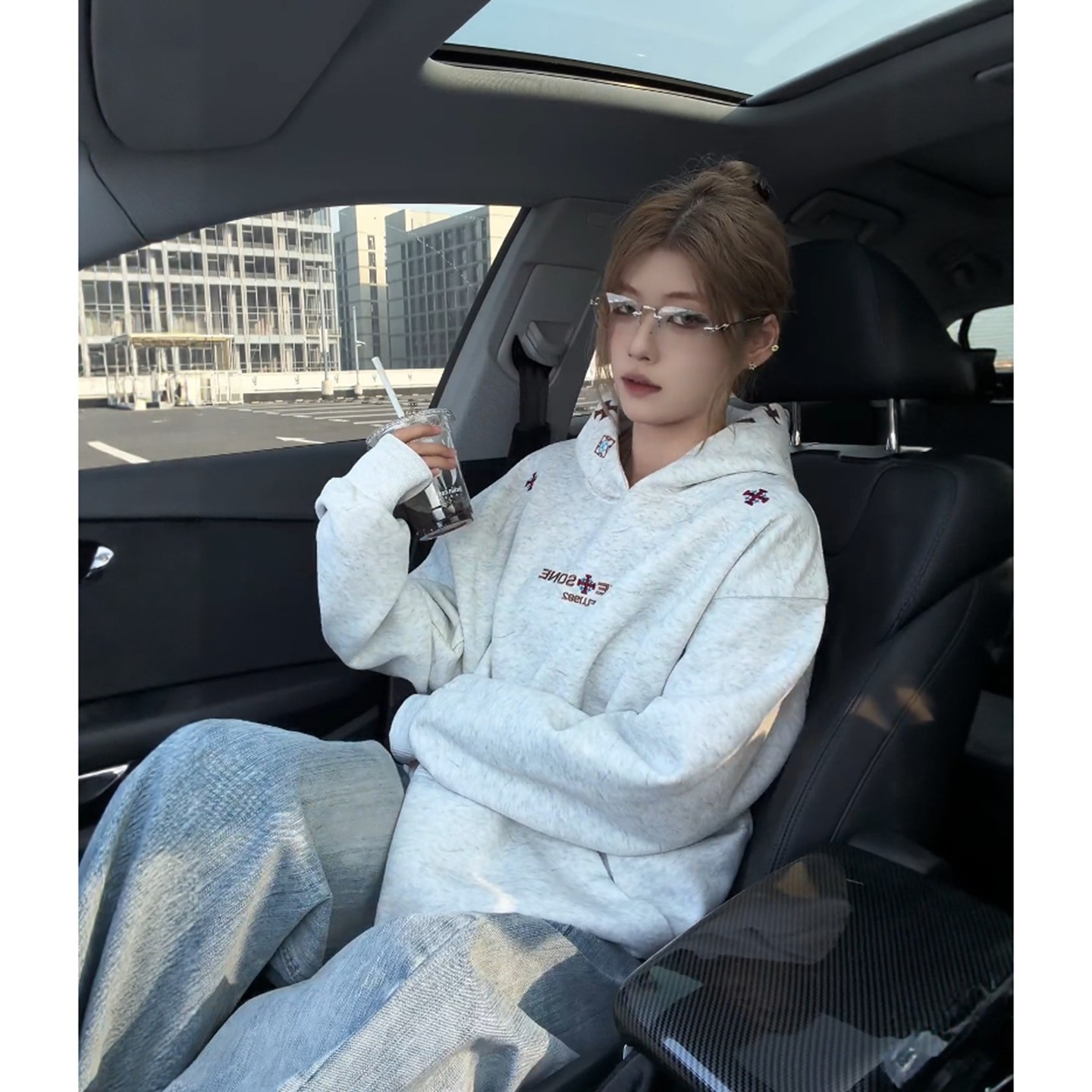 复古 连帽秋oversize刺绣字母上衣美式 森马卫衣女中长款 撞色插肩袖