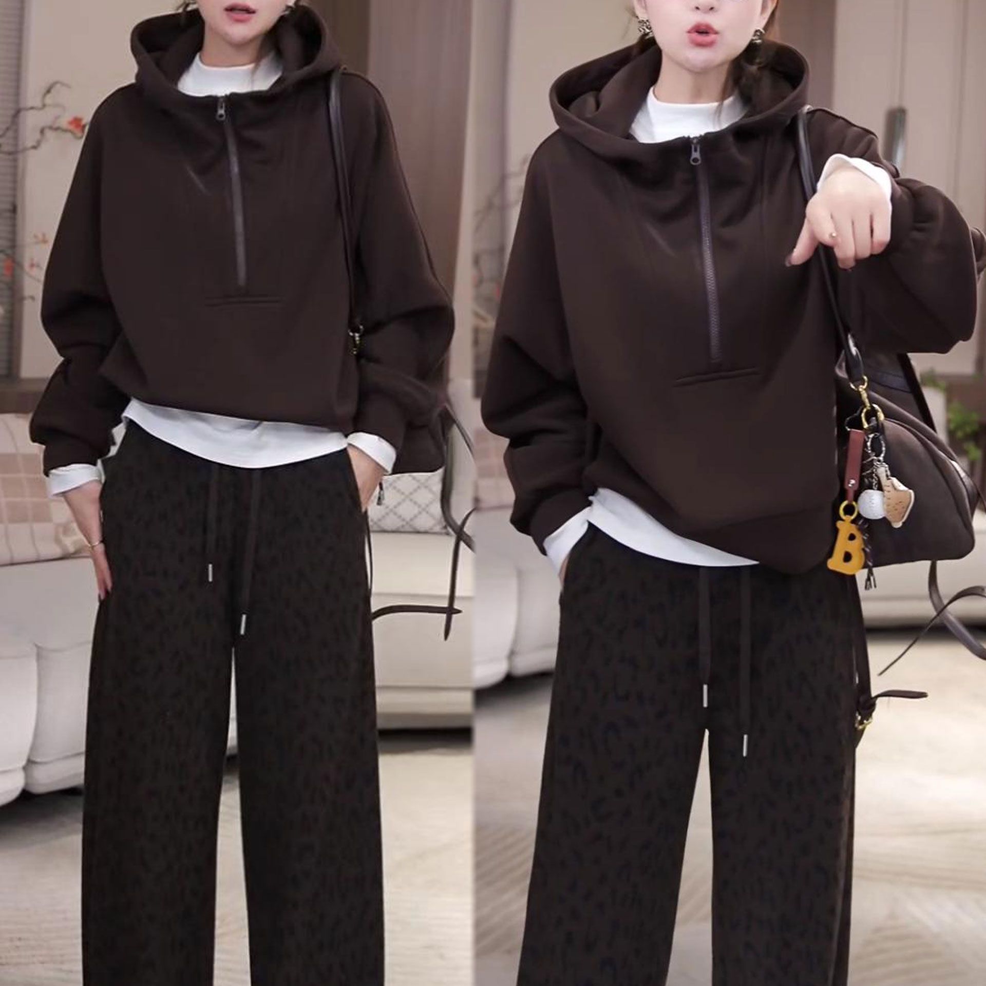 2025秋冬新款 拉链拼接卫衣宽松显瘦松弛感纯色百搭连帽上衣潮 时尚