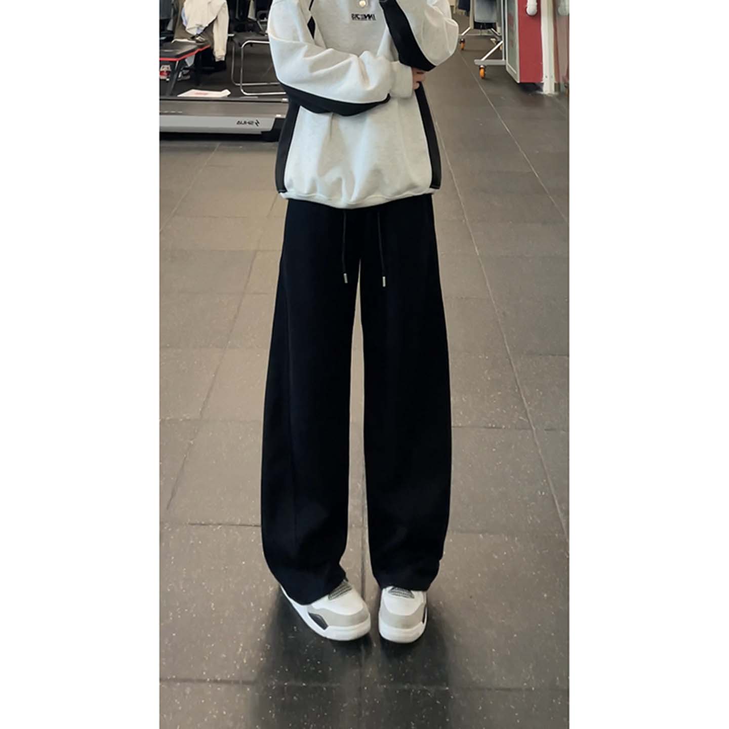 宽松直筒阔腿运动裤 新款 子 女秋季 藏青色苹果刺绣高腰抽绳休闲卫裤