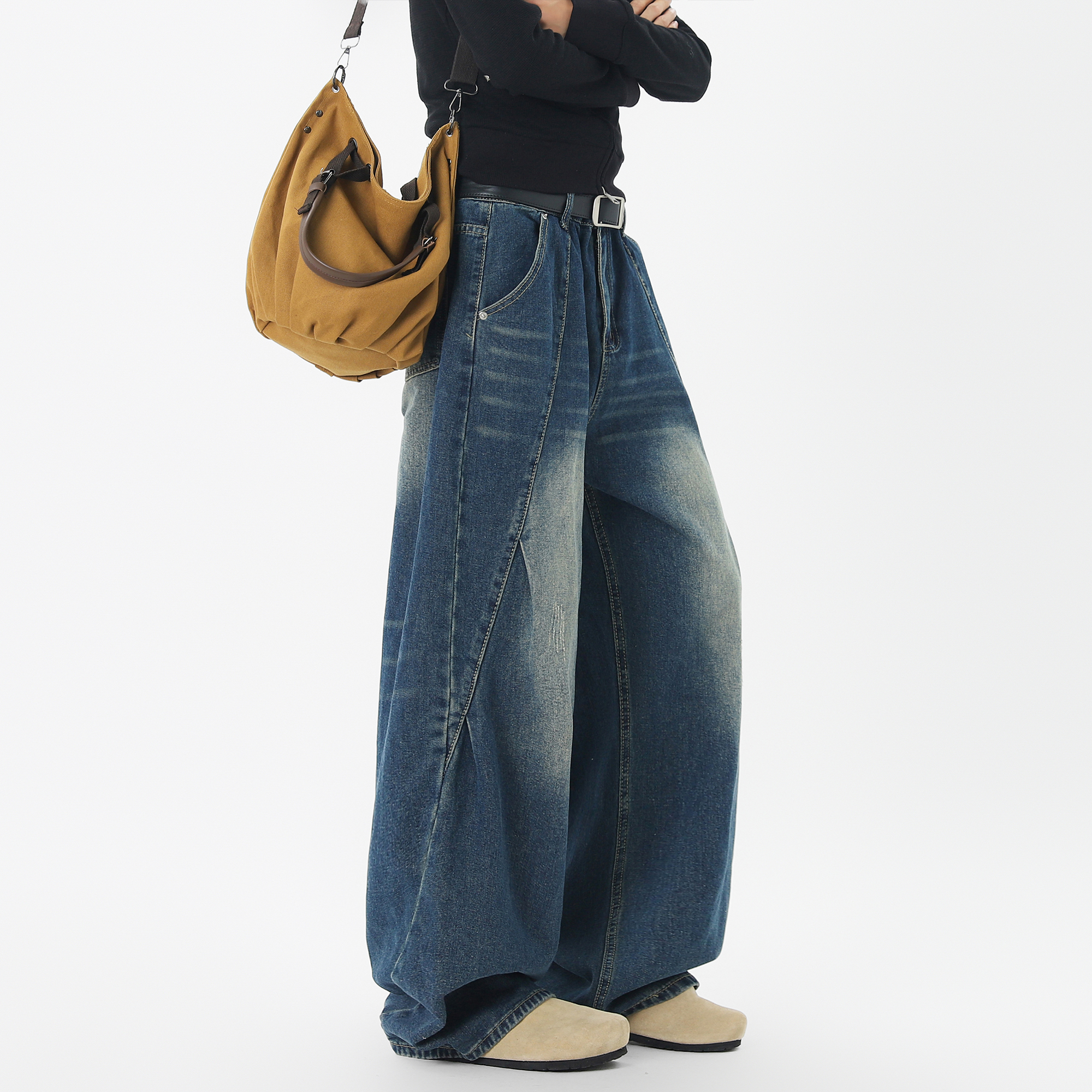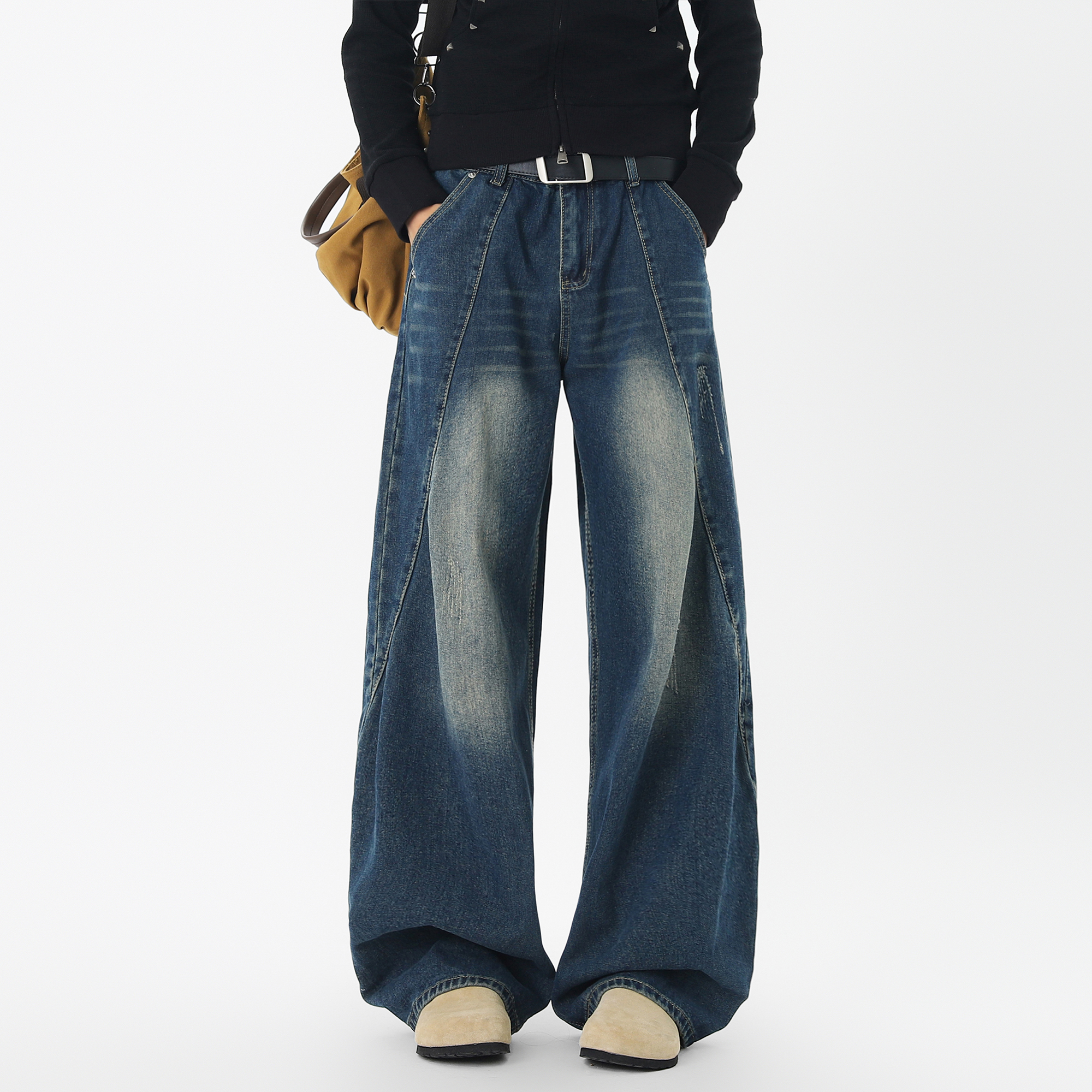 潮牌复古宽松阔腿弯刀长裤 男生秋季 子 水洗做旧拼接褶皱牛仔裤 美式