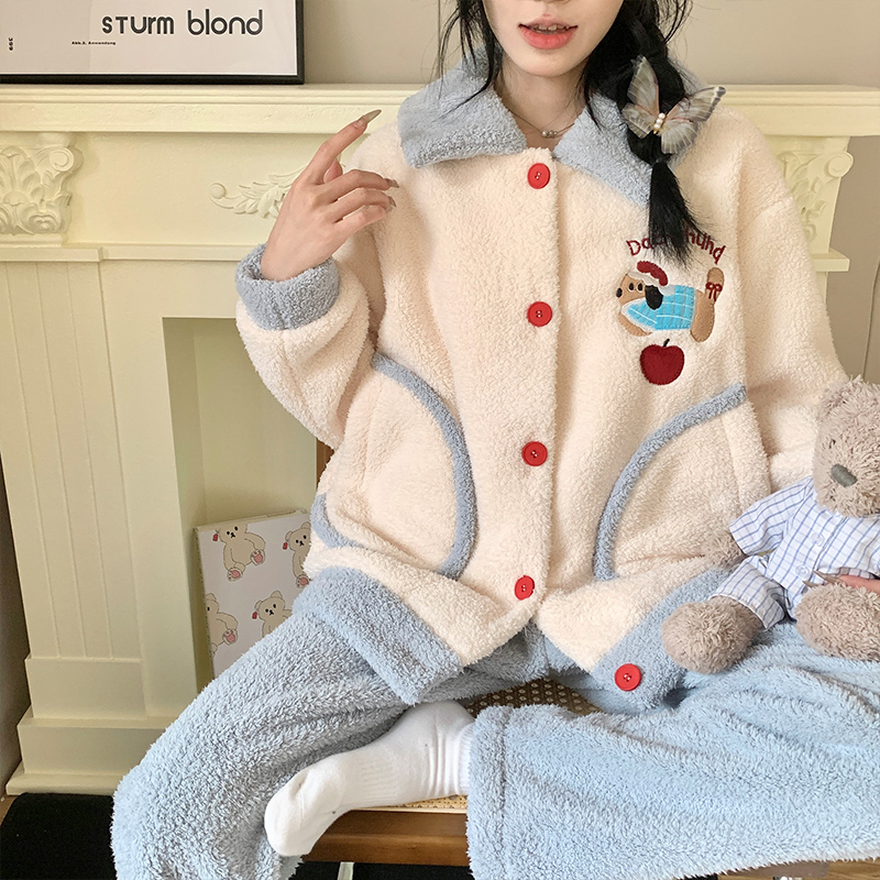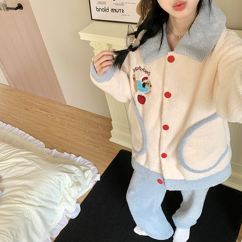 家居服套 少女米粒绒冬款 珊瑚绒睡衣女秋冬季 加厚保暖可爱卡通开衫
