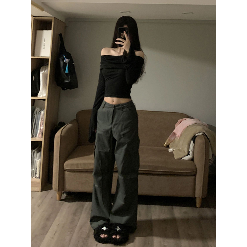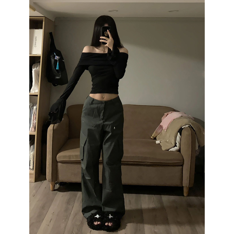 掐腰内搭短款 早秋纯欲辣妹修身 露肩上衣 一字肩黑色t恤女长袖 法式